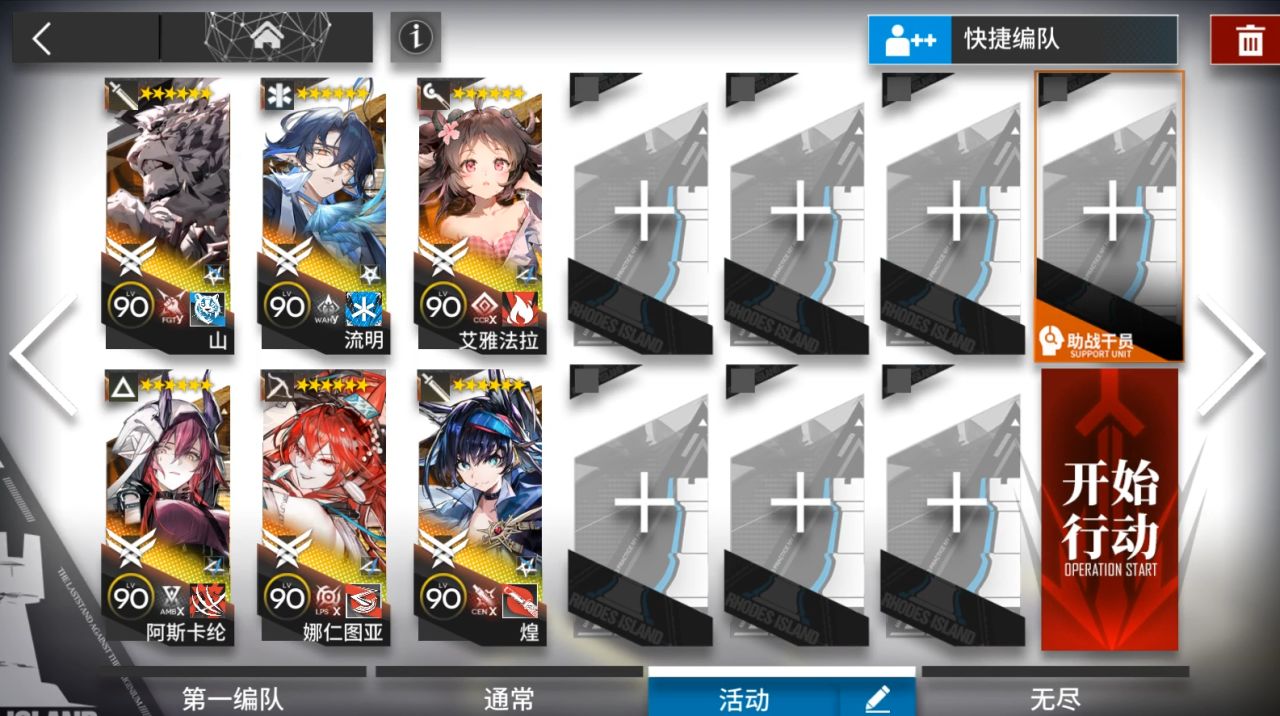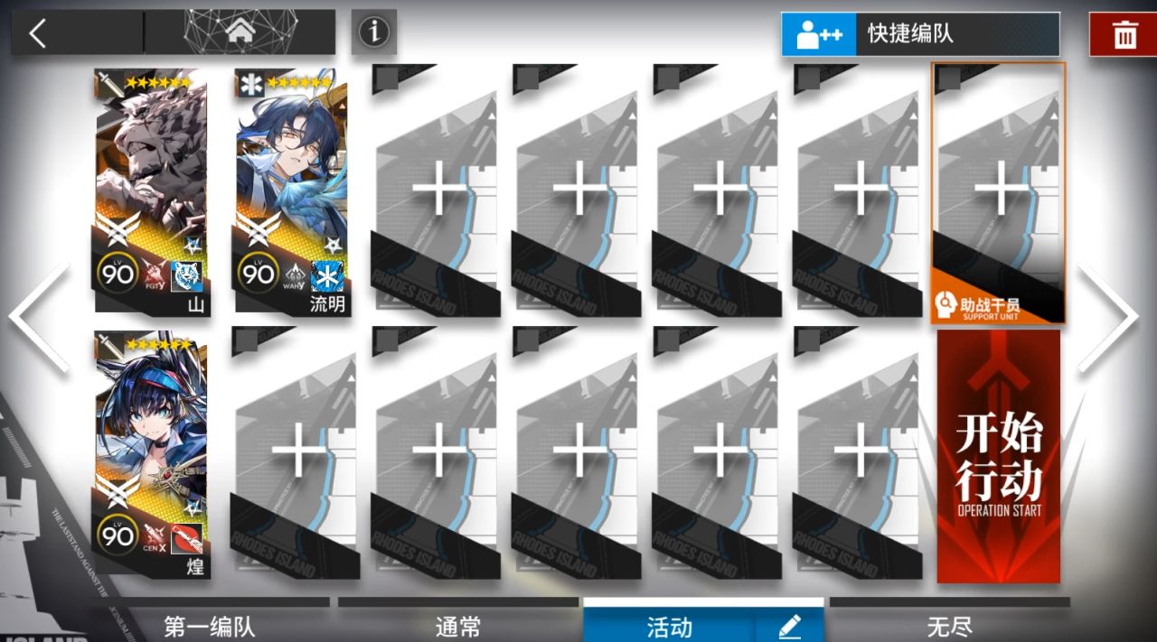 普通關卡有蝕刻章需要奶滿水池,所以需要額外帶2個醫療。奶右邊門口水池。依次部署煌,山朝左,流明朝上掛機。