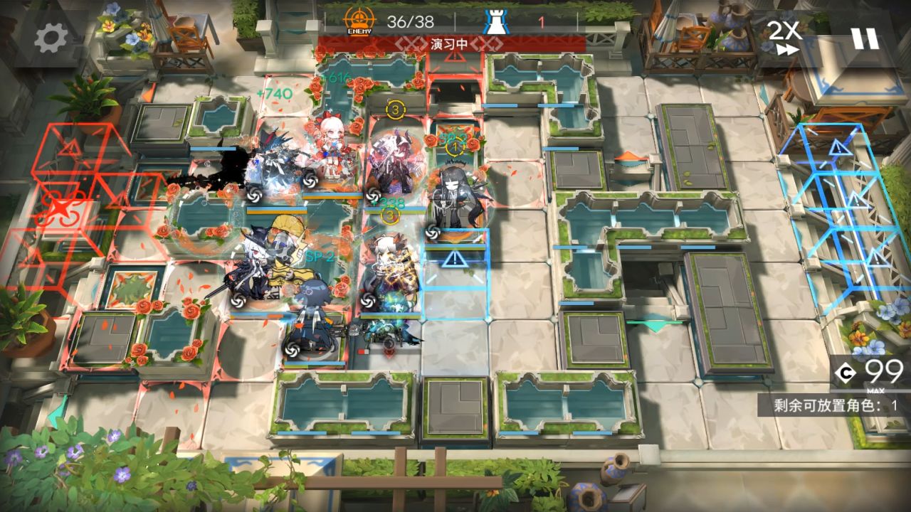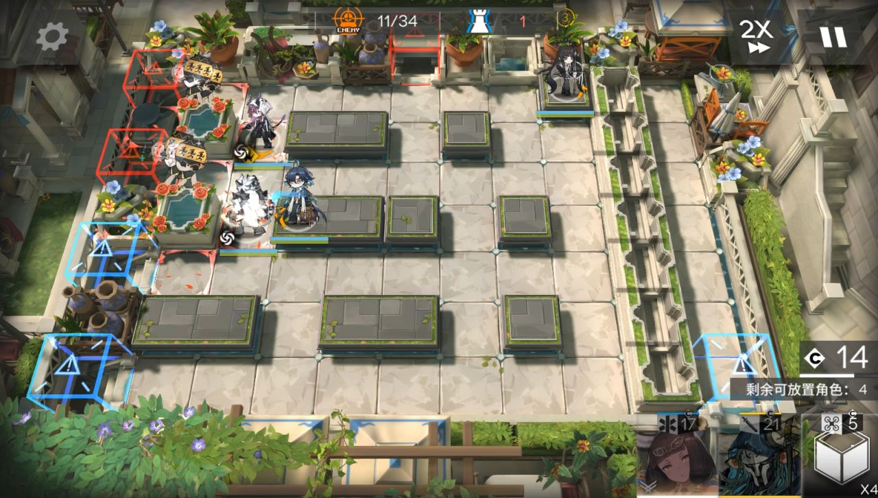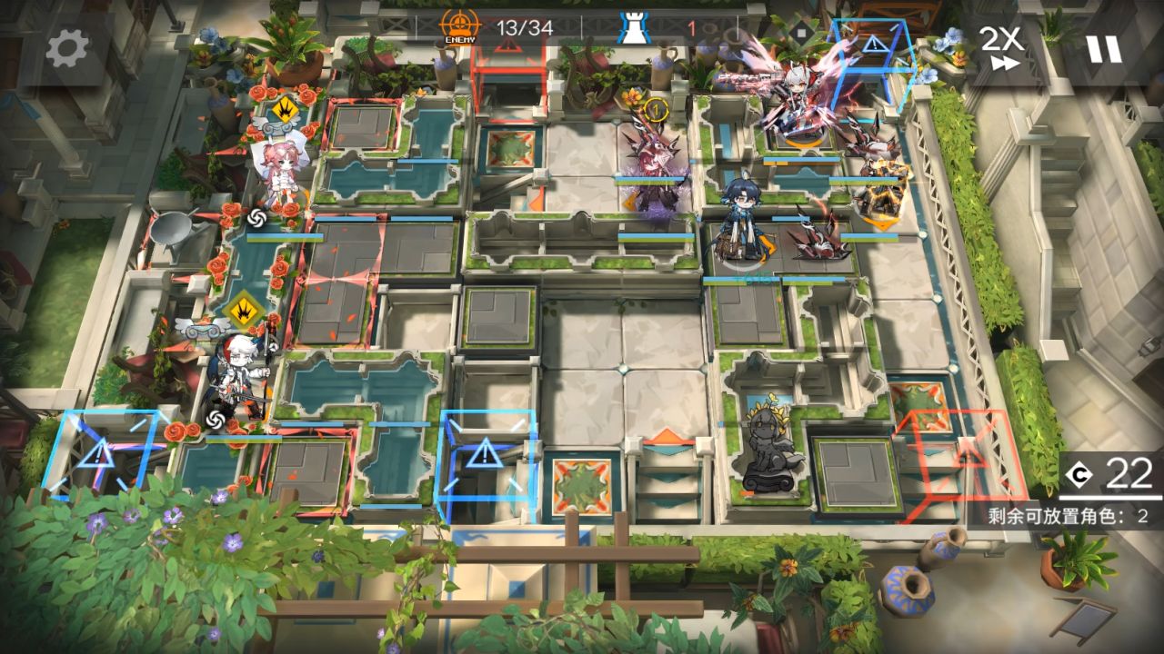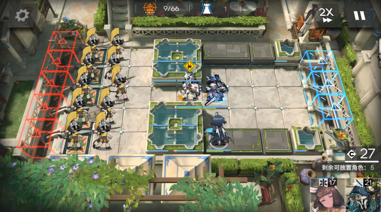 山可換其他抗傷幹員,小車換任意幹員,小羊可換能打掉藍門左邊水池雕像的幹員。右上角部署小車,大姨朝左,阿斯卡倫,流明,小羊,山都朝左。後續敵人會衝進坑,只需要保證快速打死上面和中間水池雕像,在衝鋒怪衝過來水池有花瓣。