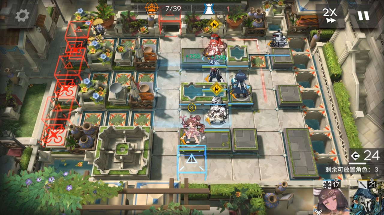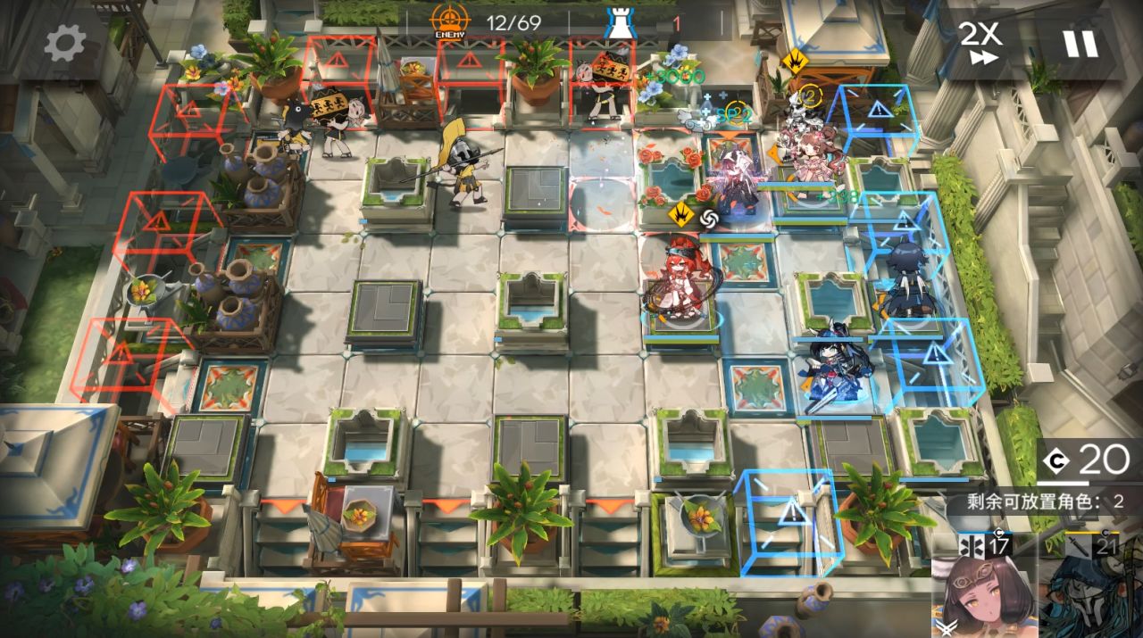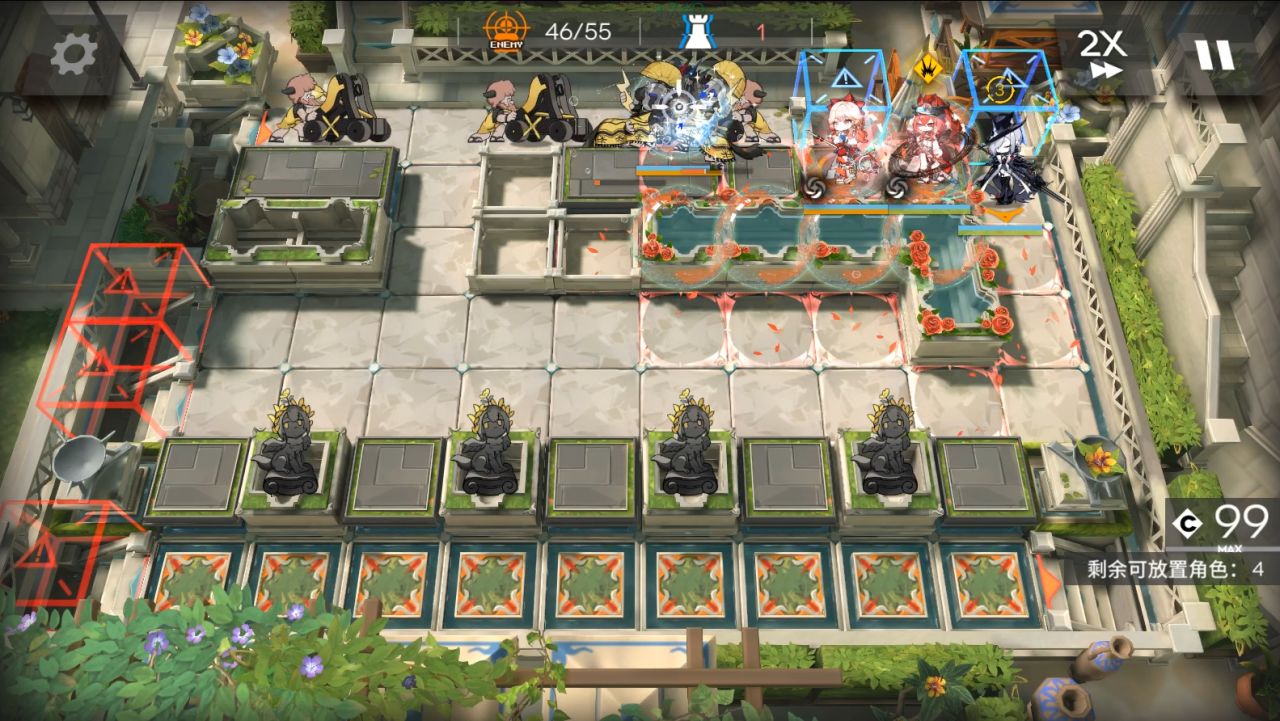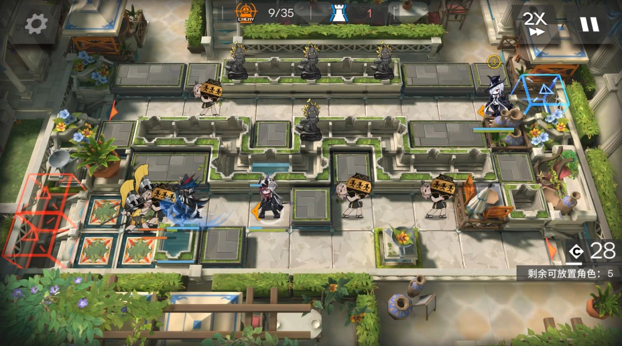山可換其他抗傷幹員,小車換任意幹員,小羊可換能打掉藍門左邊水池雕像的幹員。右上角部署小車,大姨朝左,阿斯卡倫,流明,小羊,山都朝左。後續敵人會衝進坑,只需要保證快速打死上面和中間水池雕像,在衝鋒怪衝過來水池有花瓣。
