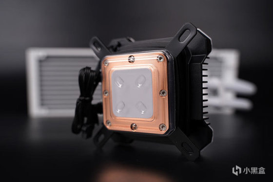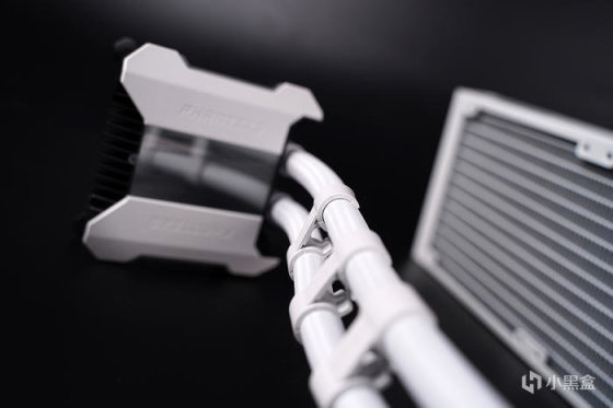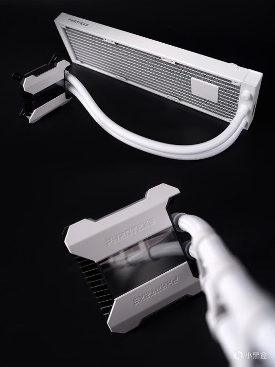 散热本体,通体白色外观设计,冷头套壳磁吸式固定,采用 CPU 避震水泵专利设计,将水泵置于冷排设计,可有效减少 CPU 共振,避免冷头共振引起松动。