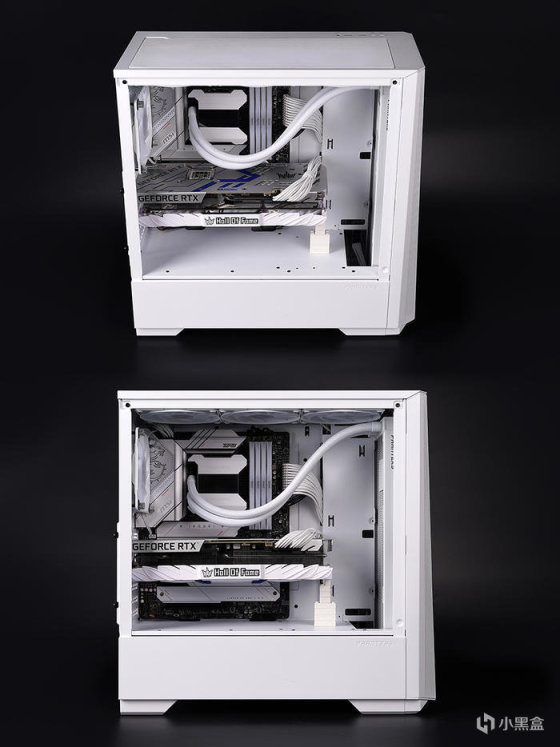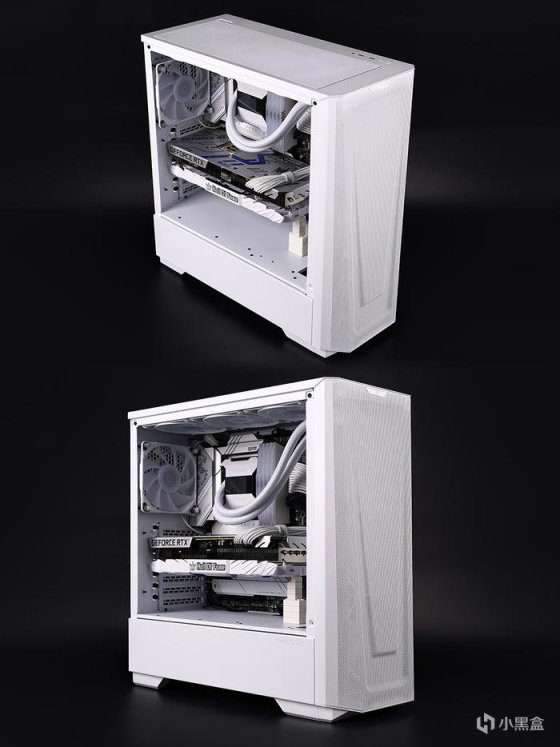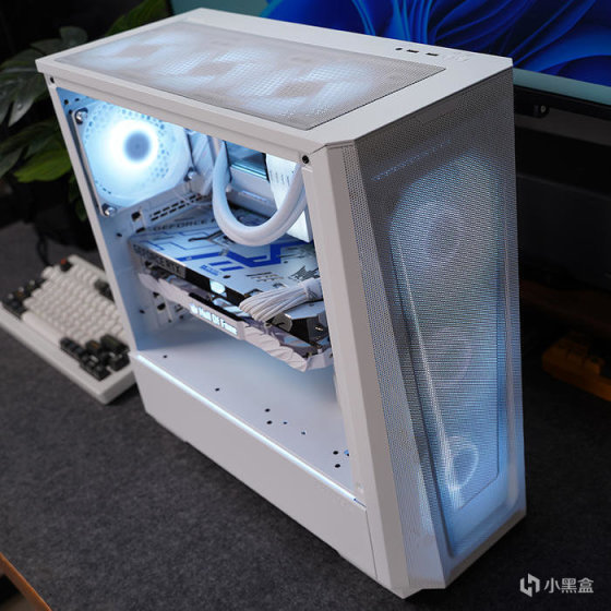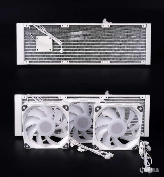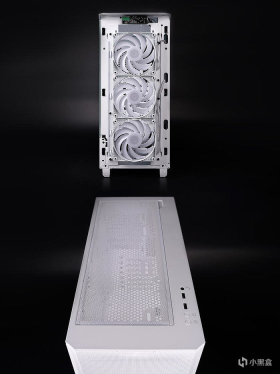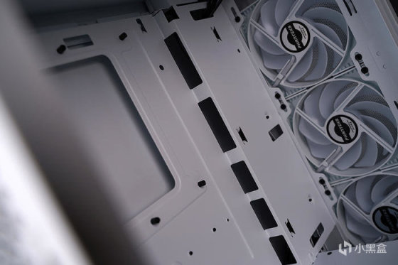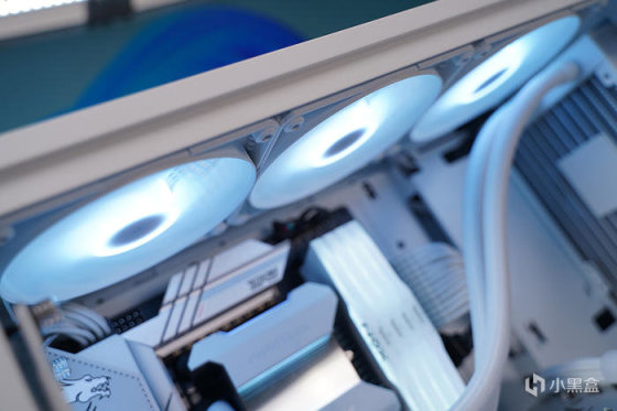 冷排散热前置安装,机箱出厂预装的三颗 AIO 水冷同款 M25 120 白色风扇挪至顶部排风。