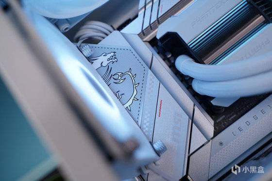 这个系列算得是 HOF 系列的亲民款,整体采用银白配色,散热器外壳用的是天使羽翼的造型设计,感觉还挺好看的,名人堂标志及正面风扇位置,带有 RGB 灯光设计,支持灯光调节。