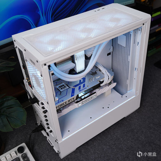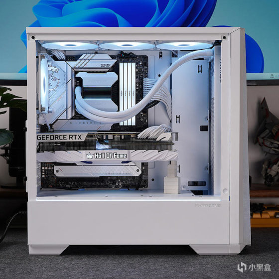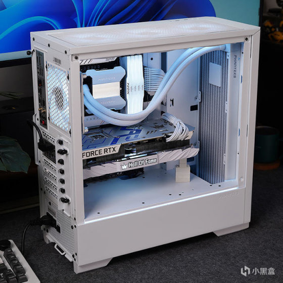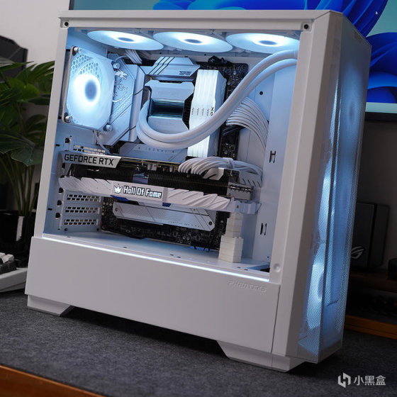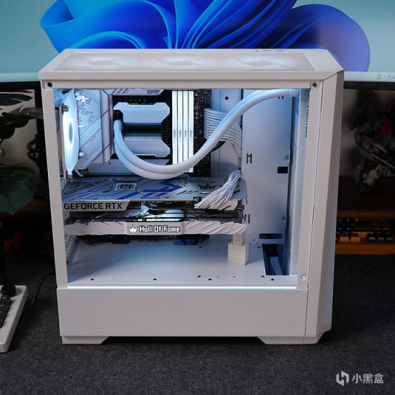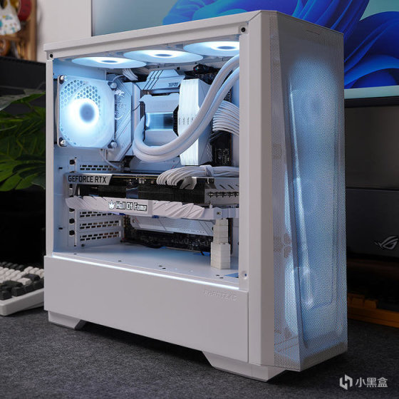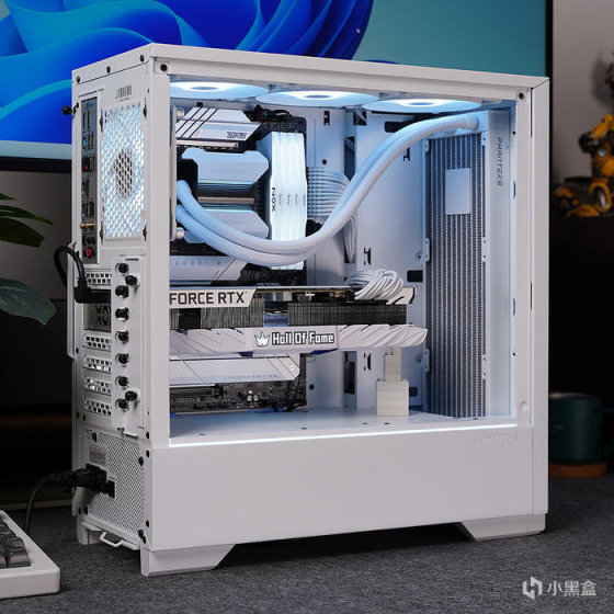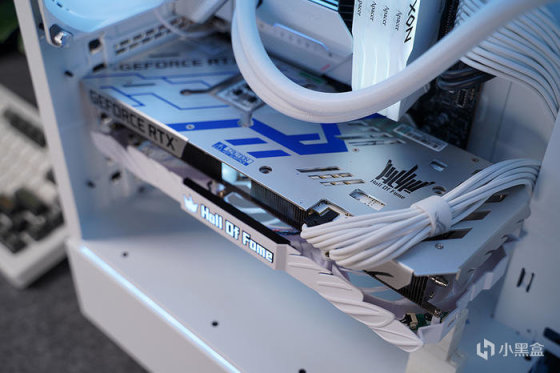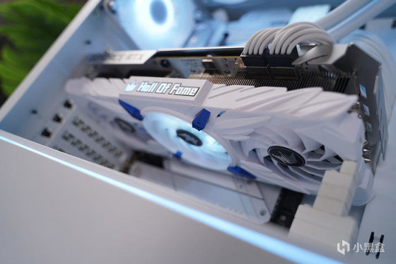 搭配白色显卡,选用的是影驰名人堂 RTX 3070TI HOF PRO,性能当下对于 2K 分辨率也还是非常够用的。