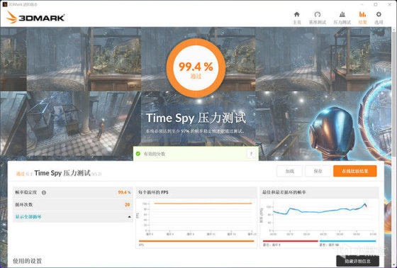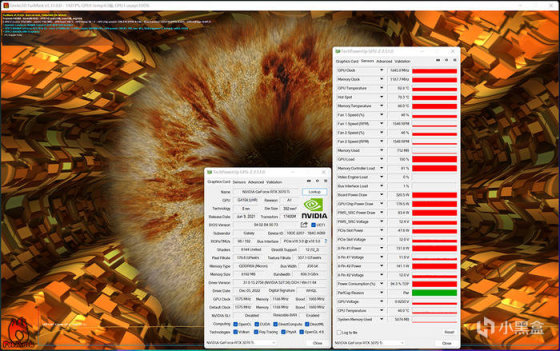 显卡 TIME SPY 压力测试 99.4% 通过,FURMARK 满载测试,GPU 降频 1845MHz ,显存 1188MHz ,过程 20 分钟左右,核心温度 62.8°C( 结温 78.3°C ),功耗 320W 左右。
