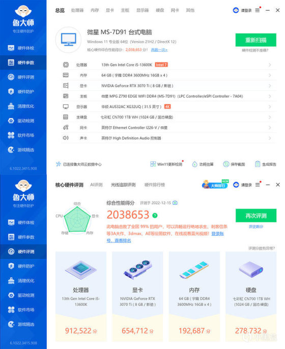 最后测试部分,室内温度 15 度左右,平台仅内存开启 XMP, 其余均为默认,WIN11 的系统,实际测试结果或多或少会有些许出入,仅供参考!首先看看鲁大师,具体的配置信息,给到的综合性能得分为 2038653。
