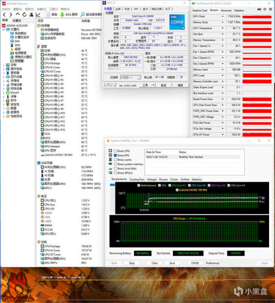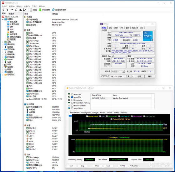 CPU 满载温度表现,AIDA64 单烤 FPU 压力测试,13600K 全核 5G,20 分钟左右,P-CORE 温度最大值 71°C,E-CORE 温度最大值 59°C,CPU 显示功耗 158W 左右。