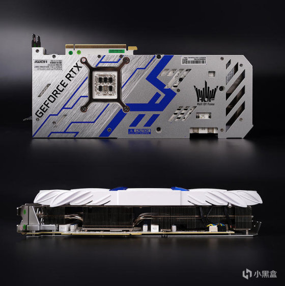 银白色的铝合金背板,保护显卡,提升颜值,表面采用了拉丝工艺,带有蓝色的条纹、HOF LOGO、GEFORCE RTX 修饰点缀,尾部菱形镂空设计,输送贯穿式的风流,强效散热效果,散热部分,外露散热鳍片加大风扇的进出风,搭配有 6 条 6mm 纯铜热管串联,均做的镀镍处理,整体可完整覆盖到核心、显存、MOS 位置,确保显卡散热稳定运行。