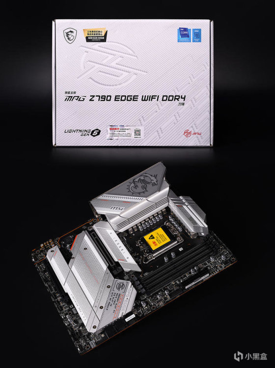 首先看看微星的主板 ,银灰色的外包装,居中 Z790 EDGE TI WIFI DDR4 型号标注,左上角 MSI 龙盾,右上角 LIGHTNING GEN5标识,主板定位于中高端用户,采用的是标准的 ATX 版型规格,表面大面积银白色金属散热马甲覆盖,上头点阵图案及文字龙标修饰,整体颜值外观相当的不错,非常适合于白色主题的装机方案。