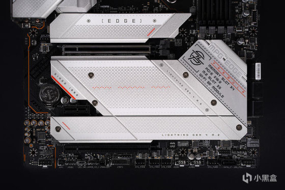 带有 5 个 M.2 存储接口,分布于 PCIe 卡槽之间,均覆盖有金属马甲散热,均为 PCIe 4.0 接口,其中 M.2_1 为 CPU 直连,其它 4 个 M.2 则由芯片组提供。