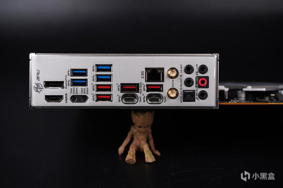 银白色一体式 I/O 挡板,从左到右分别为 HDMI 及 DP 输出接口、 Clear CMOS Flash BIOS 重置及升级按钮、四个蓝色的 USB 3.2 GEN1 Type-A 5GB 接口、四个红色的USB 3.2 GEN2 Type-A 10GB 接口、一个 USB 3.2 GEN2 Type-C 10GB 接口、一个 USB 3.2 GEN2×2 Type-C 20GB 接口、2.5G LAN 接口、Wi-Fi 6E 蓝牙天线接口、音频接口支持光纤输出。