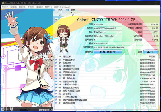七彩虹 CN700 战戟 PCIE 4.0 1TB CrystalDiskInfo 硬盘信息,测试温度最高 42 °C。