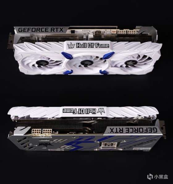 显卡侧面,采用双 8PIN 供电接口设计,外露散热鳍片加大风扇的进出风规模,HOF LOGO 及 HALL OF FAME 名称同样带有 ARGB 灯光设计,支持自家的灯光控制系统,亦可通过连接线,同步各大主板厂商,内采用的是 10 相 GPU 供电与 2 相显存供电,搭配纯白的 PCB 及定制白色电感。