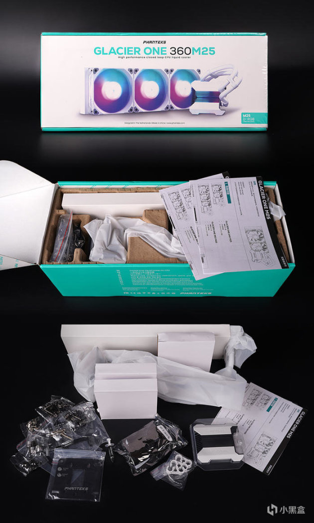 散热器选用的是追风者的冰灵 M25 360 一体式水冷,包装冰蓝黑配色,正面搭配产品渲染图示意修饰,环保纸浆塑形纸盒,里头产品为喜闻乐见的环保纸浆塑形纸盒,本体附件带套区分包裹保护,附件方面,扣具支持 AMD4 及 INTEL 平台( 支持 1700 平台),另附带有灯光连接线、理线管夹、散热硅脂。