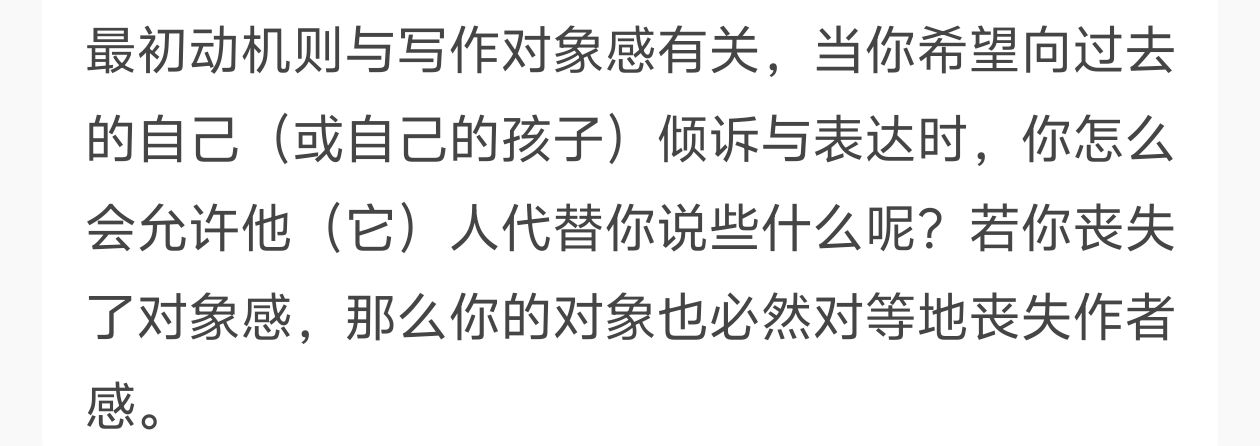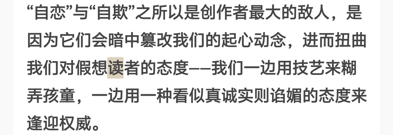 后来真正开始学习写作时,第一步就是改掉这个“坏毛病”。不是说这样做会影响观感,也不是说人们更喜欢直接得到观点,哪怕事实的确如此,但更关键的原因在于——要相信“你的文字”,要相信“你的读者”。添加缓冲词有种“我不想为文字负责”的意味,哪怕本心并非如此,但只要是为他人而写作,就必须要拿出诚意,试着看到对方,试着相信对方。