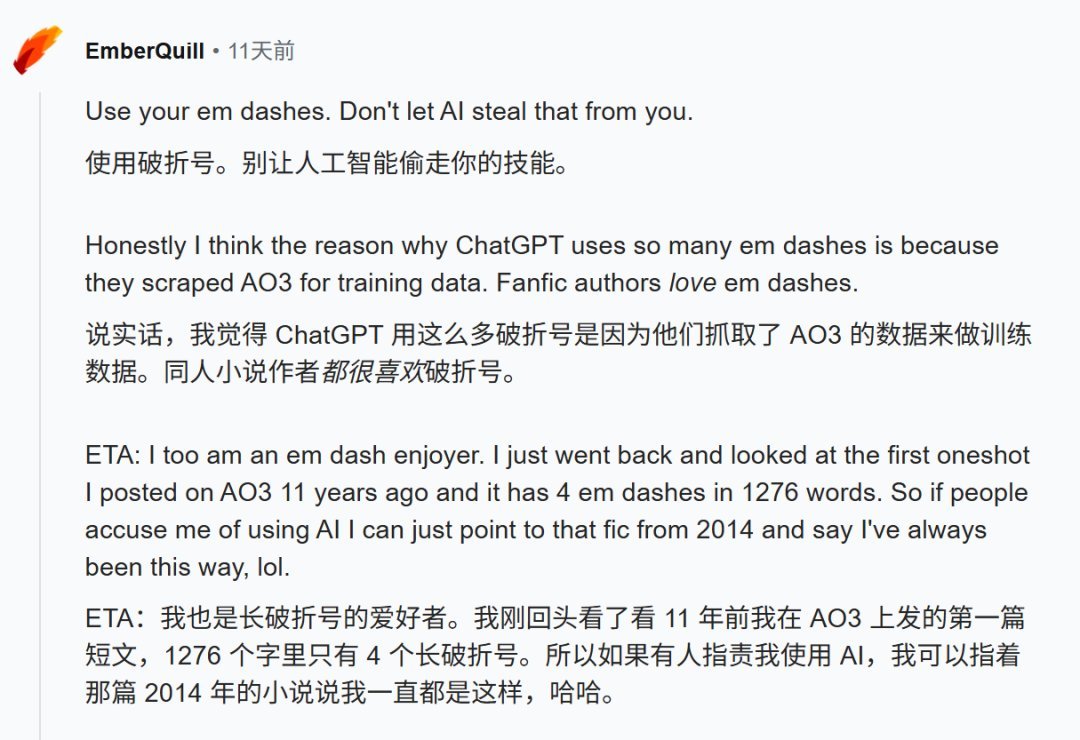 朋友也曾向我推荐了一篇文章,大致意思是:AI的训练语料常会有破折号,很多人看到破折号就怀疑某些文字为AI生成的,而一些本就喜欢使用、正常使用破折号的人,却遭受了无妄之灾......