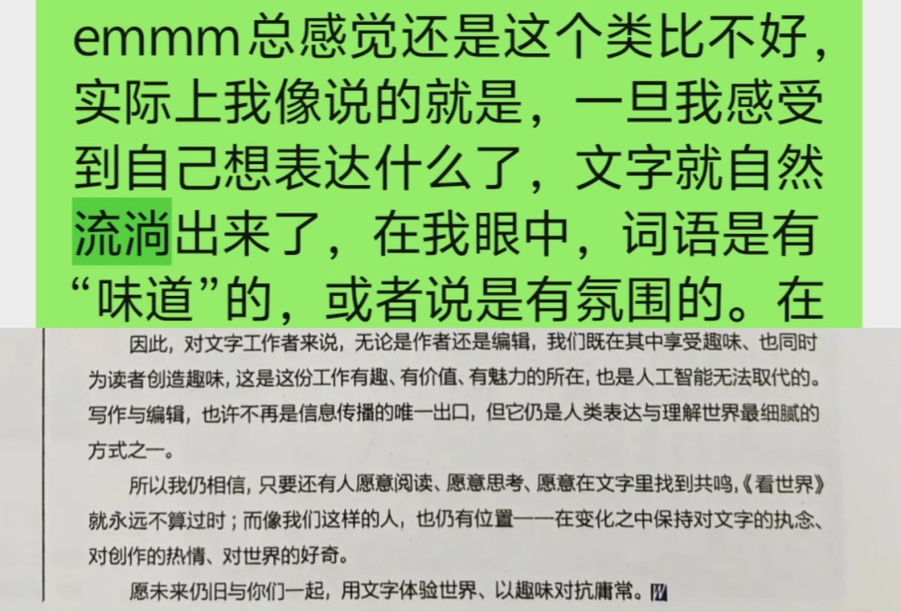 在多次写作经历当中,文章最后的结构和初稿是完全不一样的,常常是在润色过程中不断修改成最终的样子的。我写一个初稿,是我自身经验的凝练,接着交给AI,它会根据它的训练语料扩充回答,与其对撞后,几乎每次都有新的灵感。