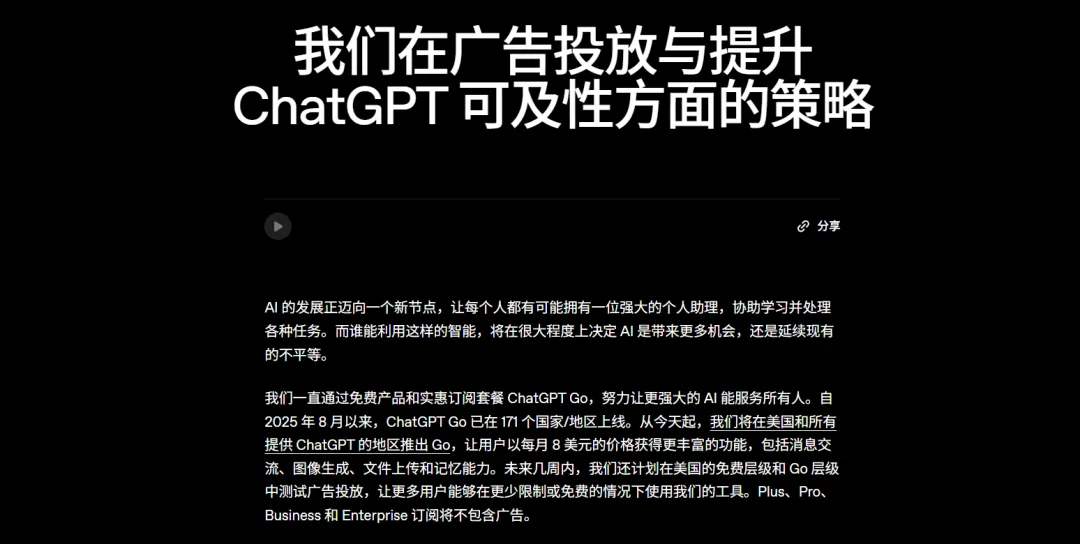 再看看 OpenAI 的官方博客,会发现他们终于把一个大家心知肚明、却一直被刻意回避的话题摆上了台面:广告。