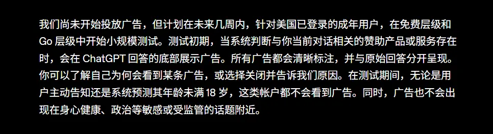 更具体一点,是在 ChatGPT 免费版以及 Go 订阅版中测试广告相关方案,同时反复强调“不出售用户数据”“广告不影响模型回答”“不基于对话内容做定向投放”等底线。