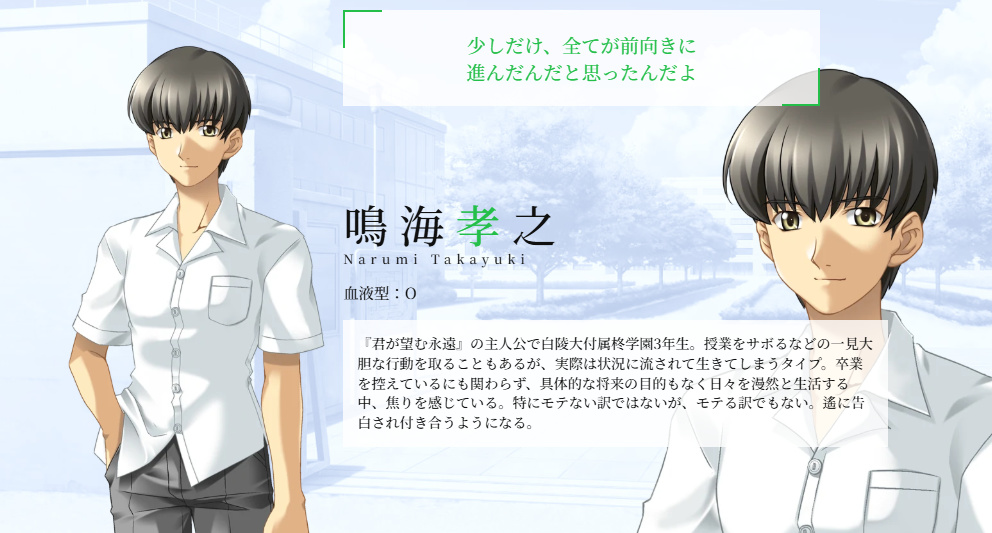 吉宗鋼紀先生告訴我,類似的情況,其實早在他創作《你所期望的永遠》時,便已經刻意有所體現:在這場畸形的三角戀中,男主角鳴海孝之總是會做出“違背玩家意願的行動”,這在很大程度上加深了其人物形象在玩家心目中“優柔寡斷”與“渣男”的特徵,更延長與加劇了故事中所有人物的痛苦。