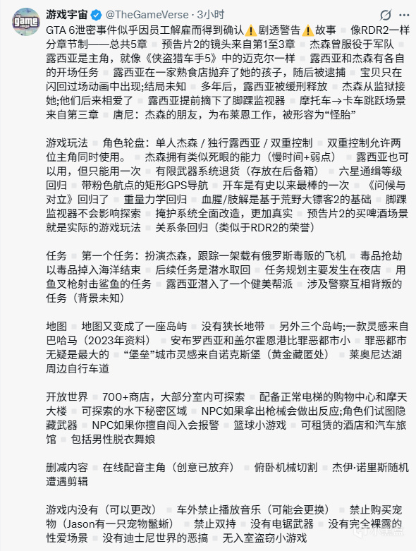 最近R星因为解雇员工的事件,导致不少关于《GTA6》的消息被透露,Reddit用户u/Snowk32与爆料人LegacyKillaHD联合发文透露了游戏的一些新的内容,一起来看看吧!