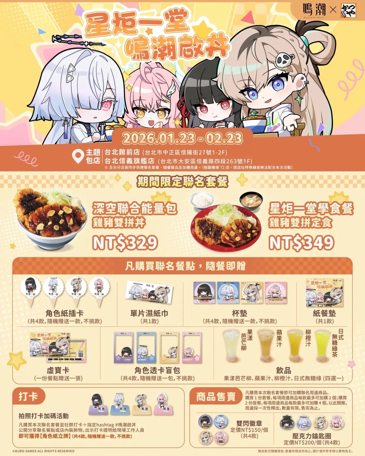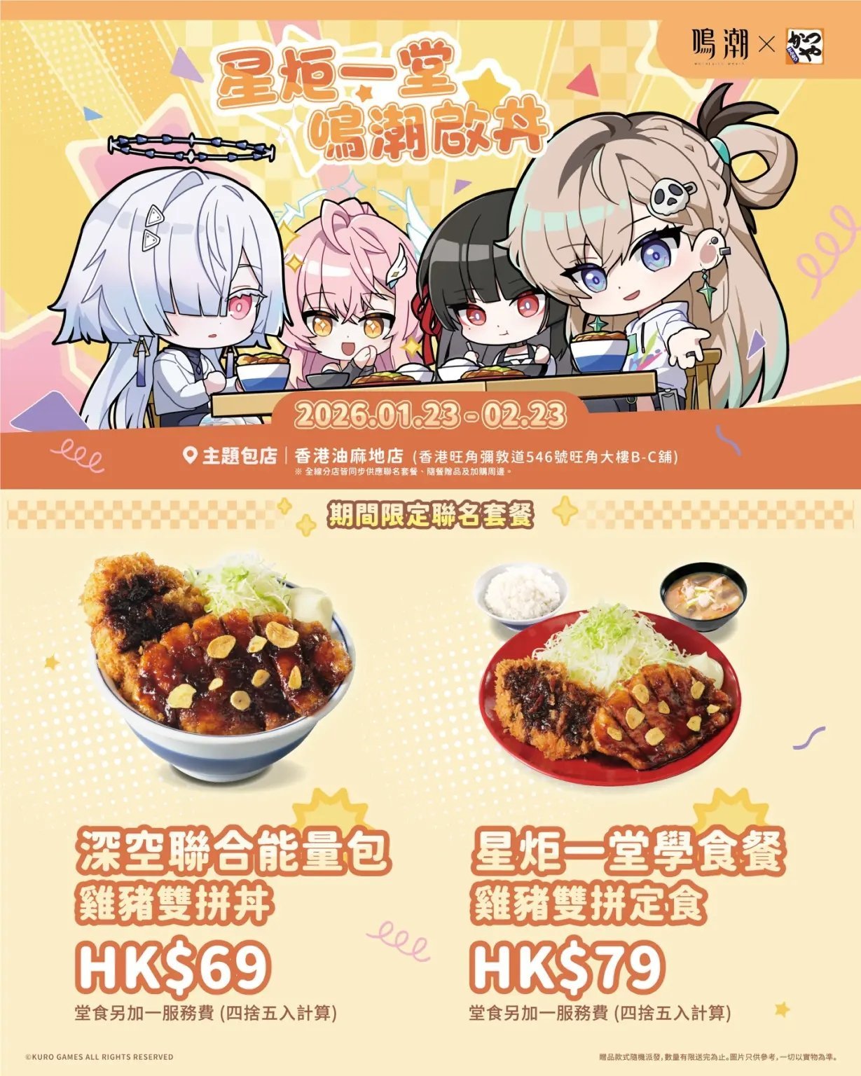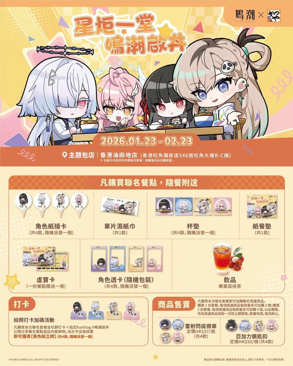 2026年1月16日,库洛游戏(KURO GAMES)与吉豚屋共同宣布,《鸣潮》将与吉豚屋在香港及台湾地区开展联名合作!台湾地区合作方为“台湾吉豚屋かつや”,香港地区为“Ca-Tu-Ya 吉豚屋 吉列猪扒专门店”,活动期间将推出限定菜单,同步附赠专属特典并售卖联名周边,两地活动内容大致相近。