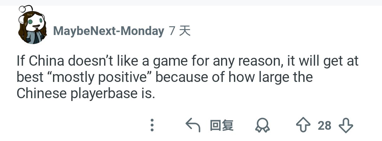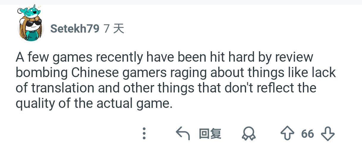 然后绝大部分老外清一色的回答:因为“兔子”玩家因为汉化问题/政治问题给游戏打差评,本身游戏是很好的