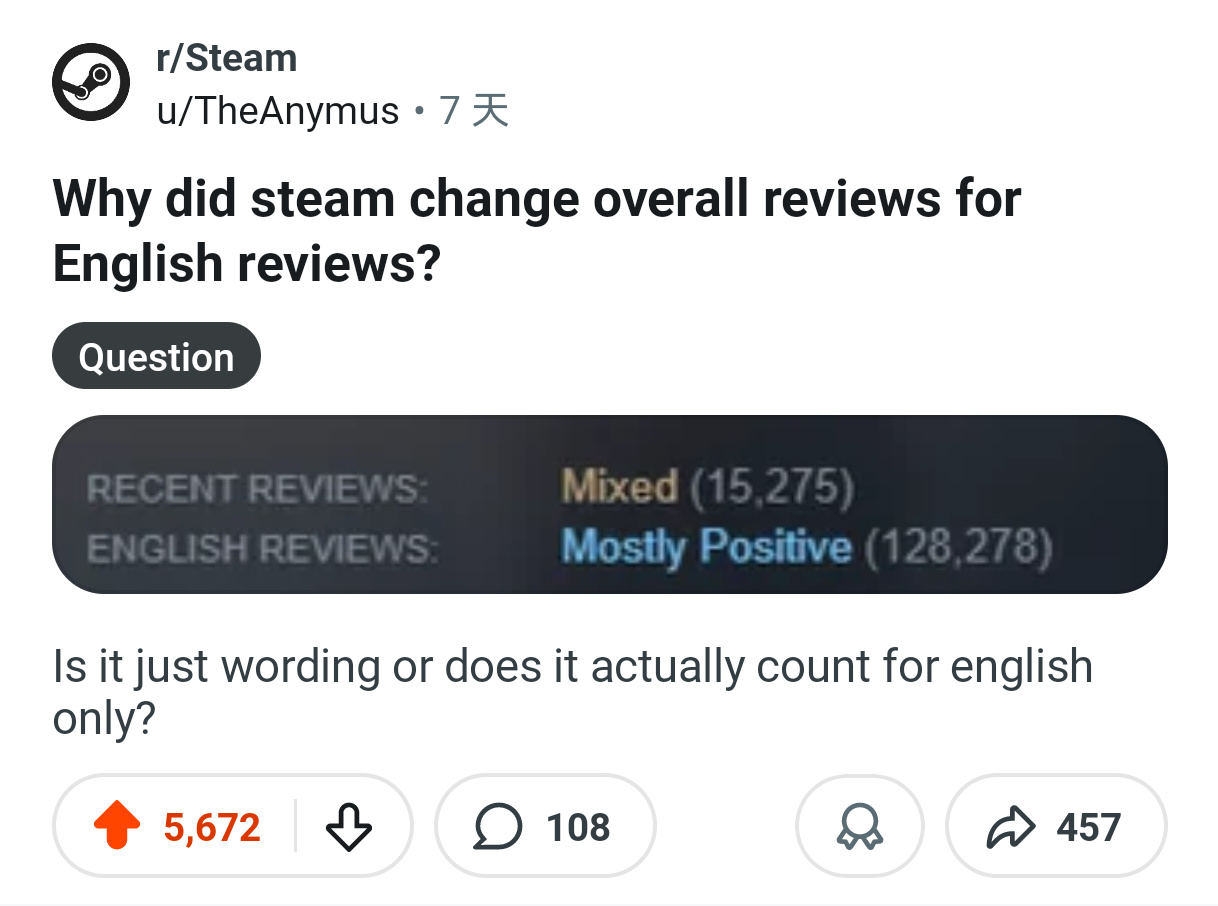 在Reddit上,某位外国游戏玩家好奇“为什么Steam评价从整体评论变成了英文评论”