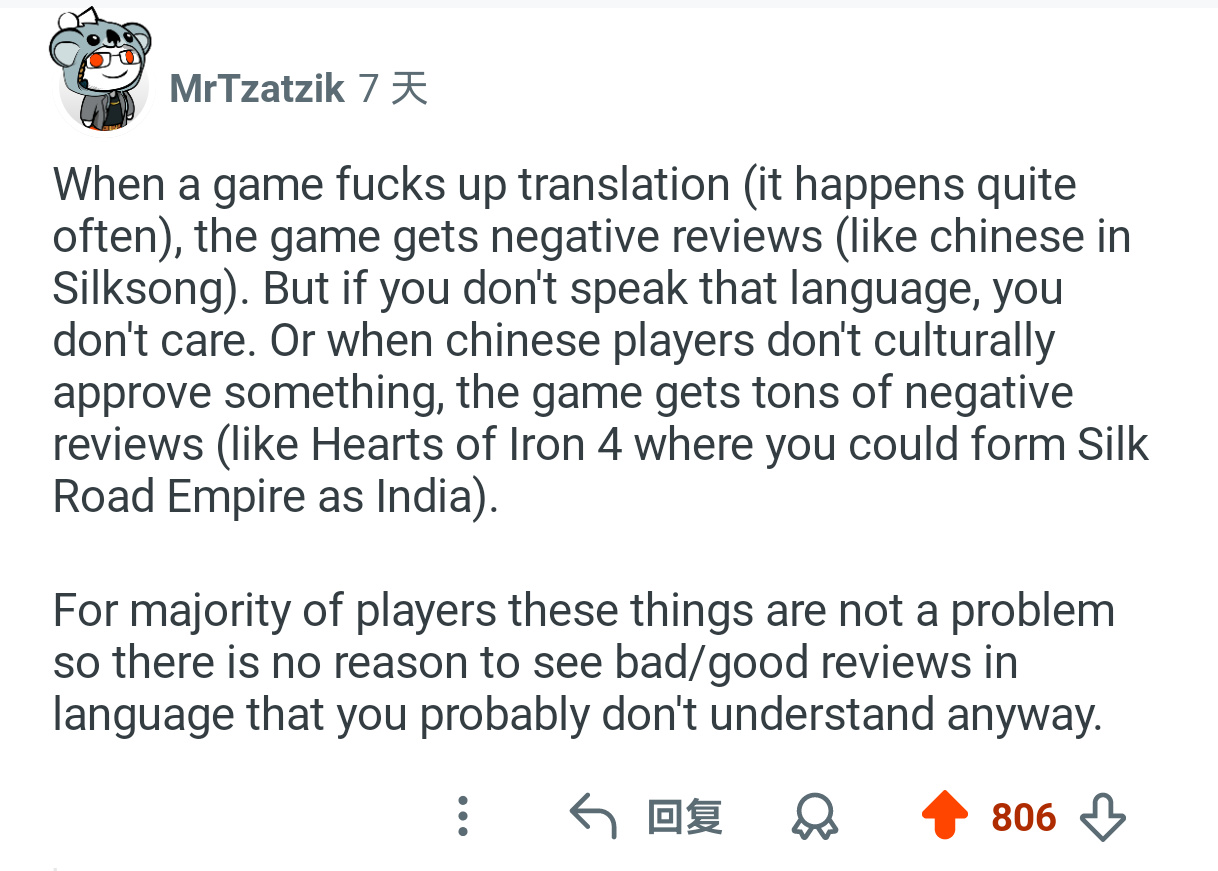 如果游戏搞砸了翻译(这很常见),就会收到差评(比如《丝之歌》的中文版)。但如果你不说那种语言,这对你毫无影响。或者当兔子玩家在文化上不认同某些内容时,游戏也会收到大量差评(比如《xx》中允许印度建立“丝绸之路帝国”)。 对大多数玩家来说,这些问题并不存在,因此没必要去看自己根本不懂的语言的好评或差评。