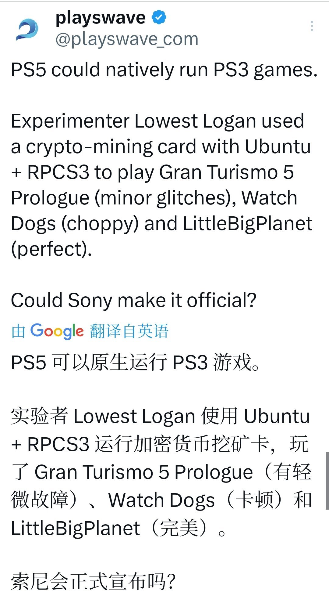 这个实验有力证明了 PS5 的硬件性能足以本地模拟部分甚至大部分PS3 游戏,而非官方声称的“太难”。RPCS3 在 PC 上已能启动数百款游戏,如果 Sony 投入资源优化,PS5 完全可以实现原生兼容。但 Sony 很可能不会这么做,原因包括: