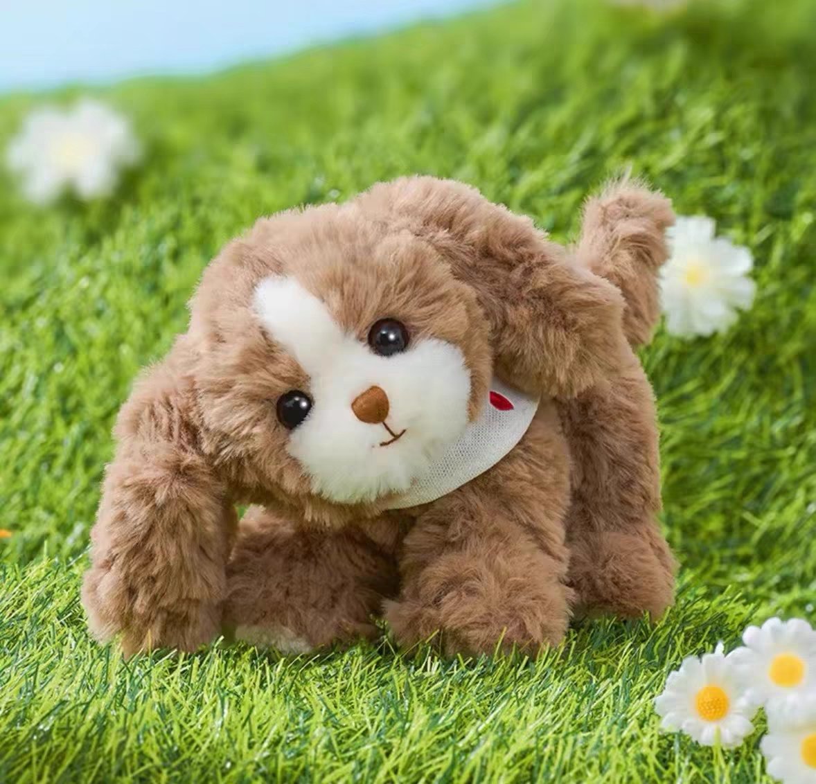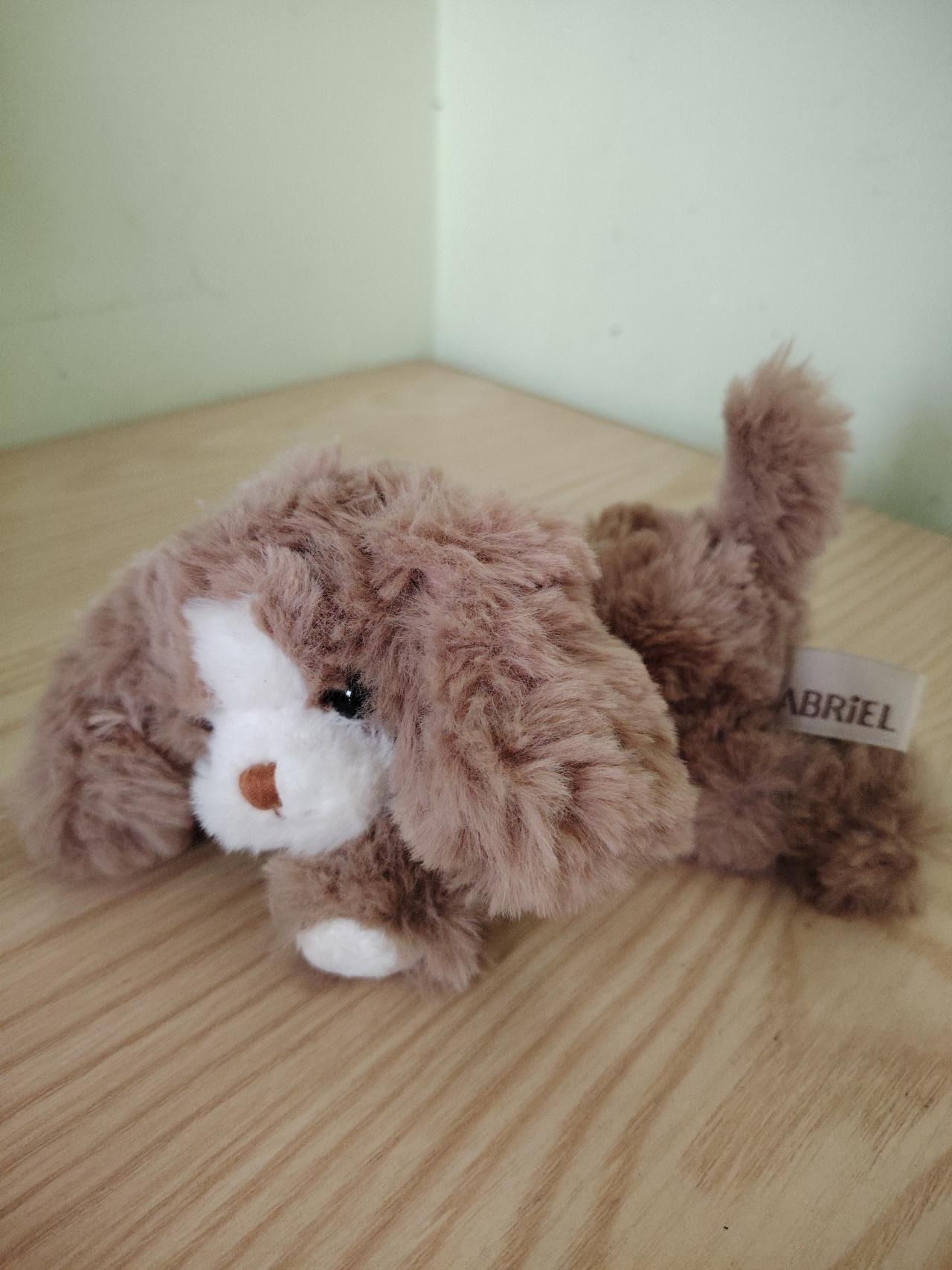这个小狗有口水巾,我觉得还挺可爱的。而且他的头是歪的,歪头小狗嘿嘿。我觉得这只小狗好在它的手感特别好,绒摸起来非常软。
