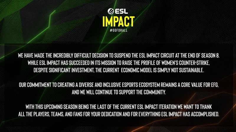 首先是第一点也是最重要的一点:增加商业价值。任何赛事如果能够成功,其底层逻辑都是一样简单:盈利[1],不赚钱的赛事是办不下去的,是没法可持续发展的,钱是赛事能活着的必要条件,所以要想发展女子电竞赛事,最重要的就是提升女子电竞的商业价值。2025年10月反恐精英头部赛事主办方ESL发布公告,将在第8赛季结束后暂停ESL Impact巡回赛,称“当前的经济模式根本不可持续”是其做出这一“极其艰难决定”的原因[2]。