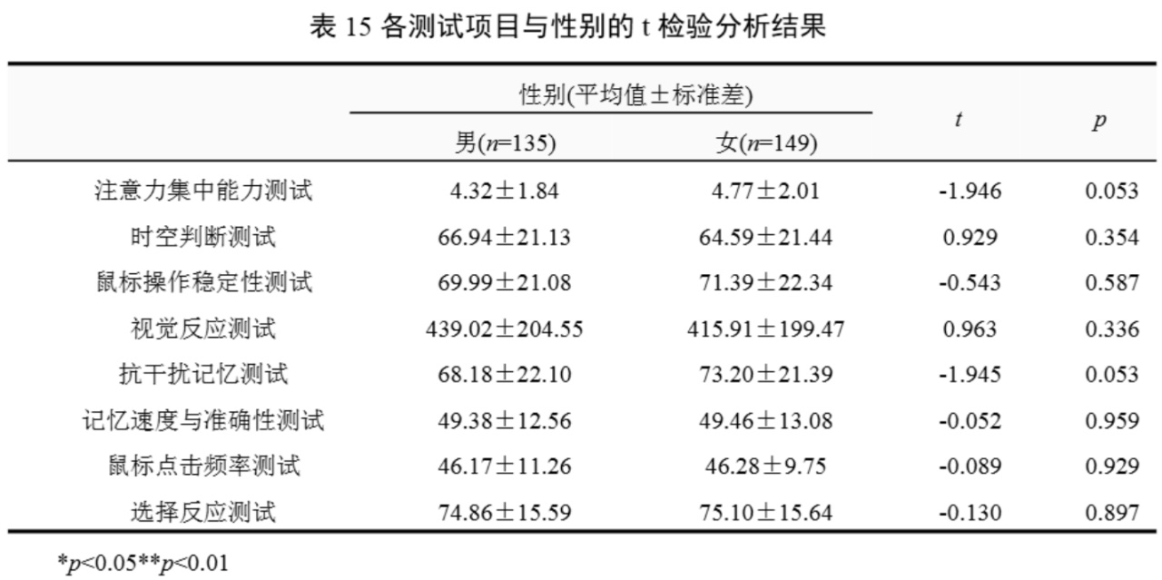 一篇西南大学的硕士论文通过对职业队员的意见调查以及专家的访谈之后,结合《运动选材学》中对于运动素质选材理论与运动心理选材理论,设计出了一些设计指标,测试结论为不同性别样本对于注意力集中能力测试,时空判断测试,鼠标操作稳定性测试,视觉反应测试,抗干扰记忆测试,记忆速度与稳定性测试,鼠标点击频率测试,选择反应测试全部均不会表现出显著性差异[4]。这在一定程度上显示男女生的身体硬件对于电竞来说没有特别大的差异。