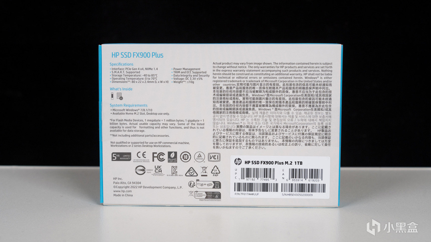 FX900 Plus 1TB出厂是预装了散热片的,无论是台式机、笔记本电脑还是PS5游戏机都可以直接安装使用,散热片是以纯黑背景+白底HP LOGO作为点缀,是最为简洁显示品牌属性的一种方式了,SSD属于标准2280和M.KEY规格设计。