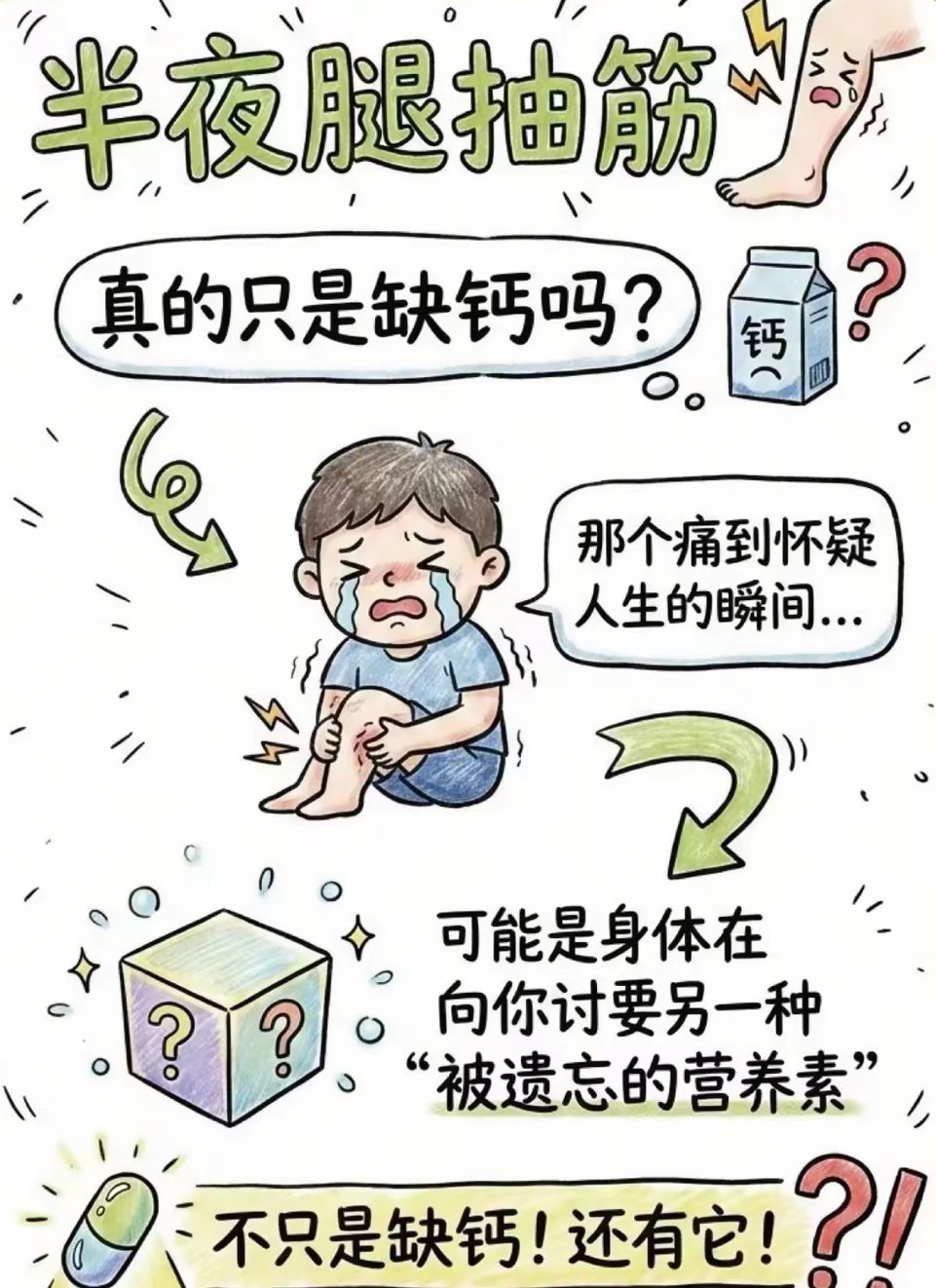 你有没有过这种体验:凌晨三点,正梦见自己在沙滩上狂奔,突然小腿肌肉像被人狠狠攥住,疼得你瞬间弹坐起来,脚趾都快抠进床垫里,嘴里还忍不住发出“啊”的灵魂呐喊。等那股钻心的疼慢慢退去,腿还得酸上大半天,睡意早就跑没影了。