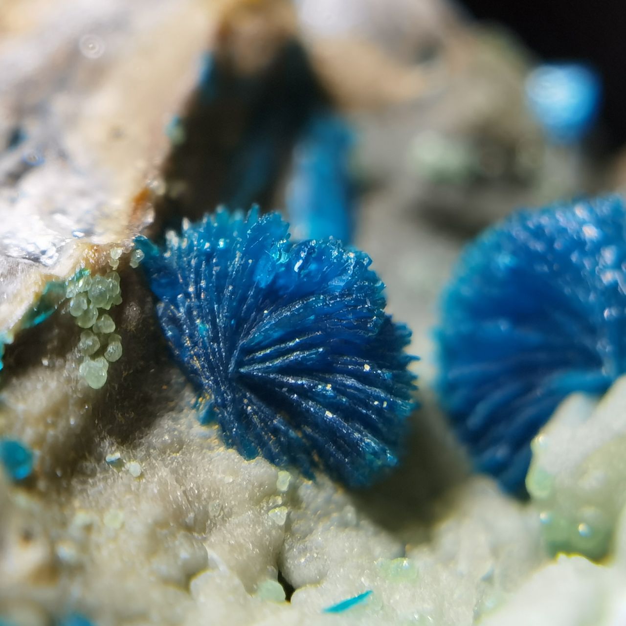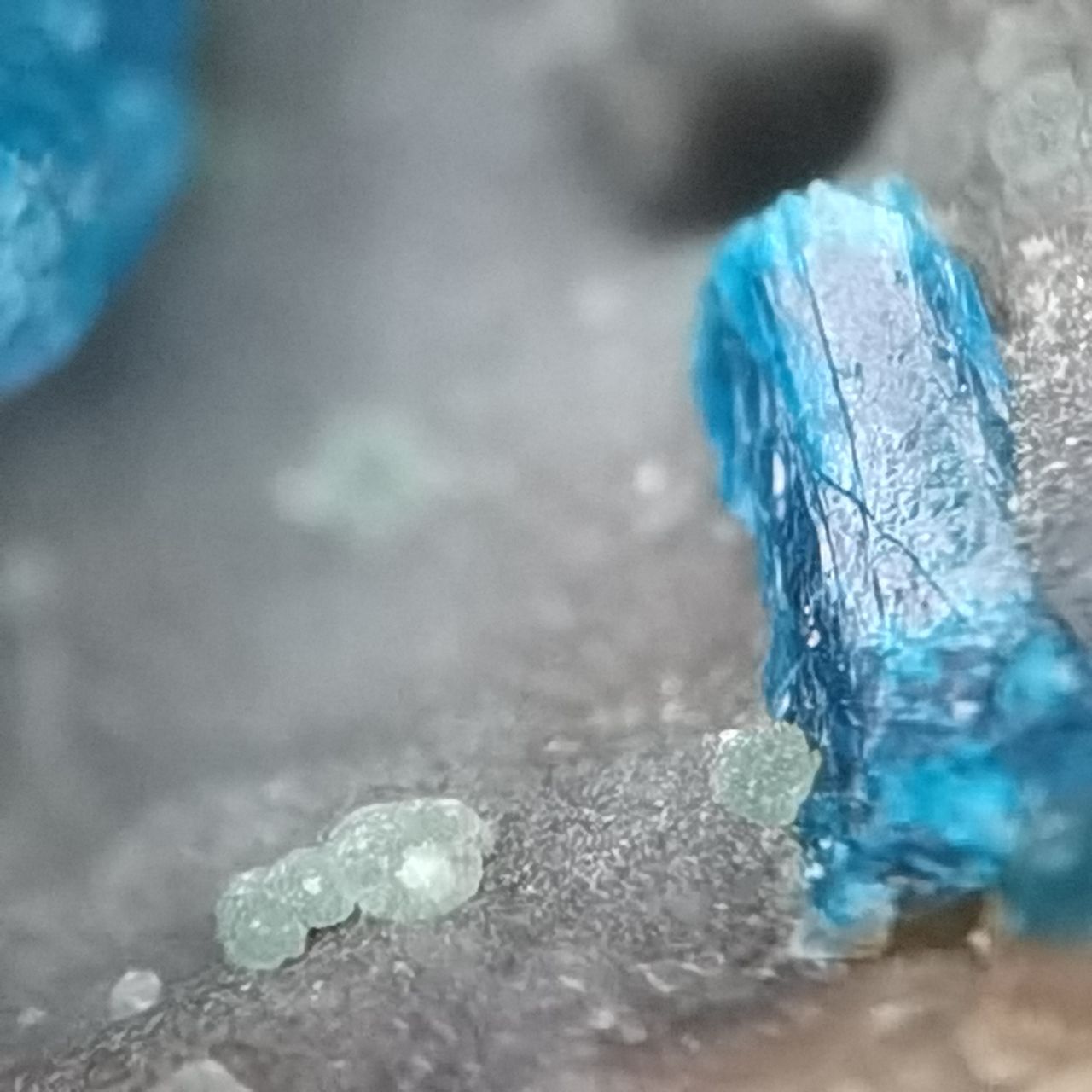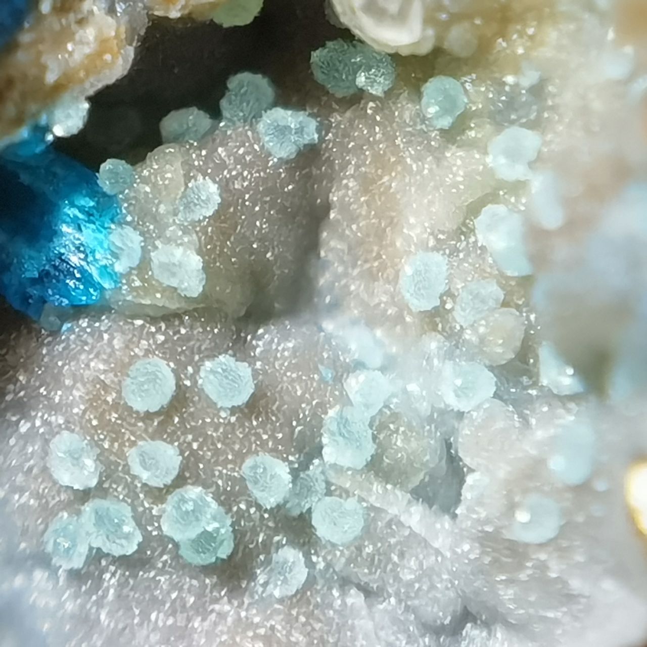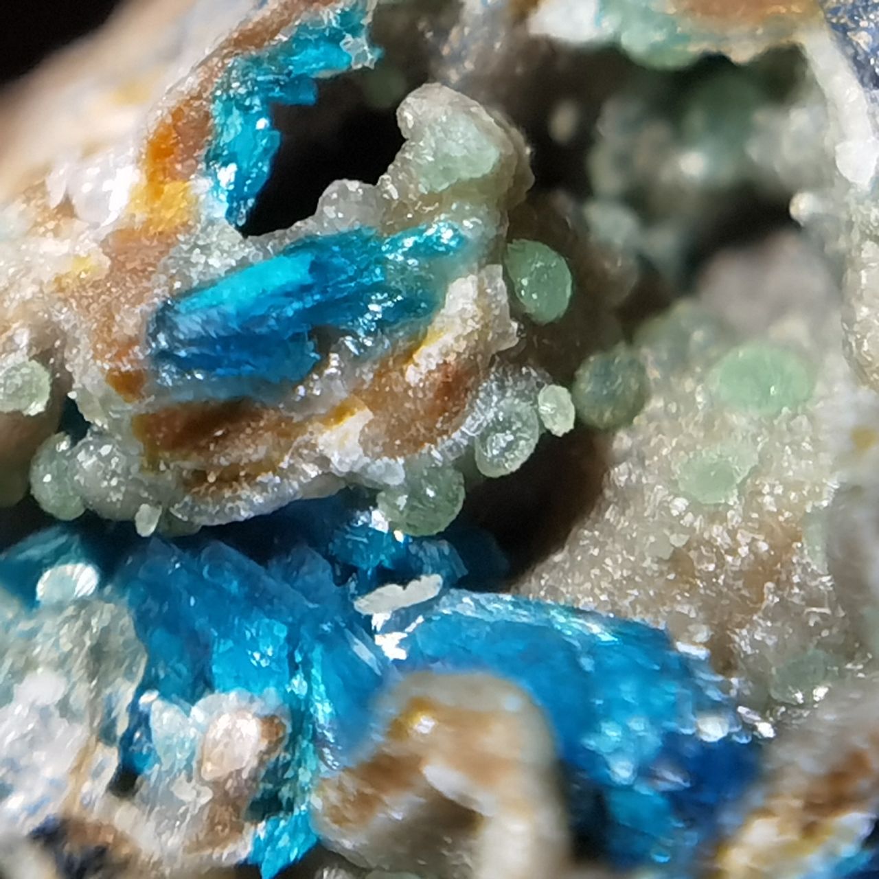 本块标本上的东川石没有经过严格的测试,因此本文就统一用东川石指代一下,其分布在标本上的各处异极矿晶洞里,青绿色/白色的球状集合体和扇形/其他形态的磷锌铜矿形成了非常好的对比。