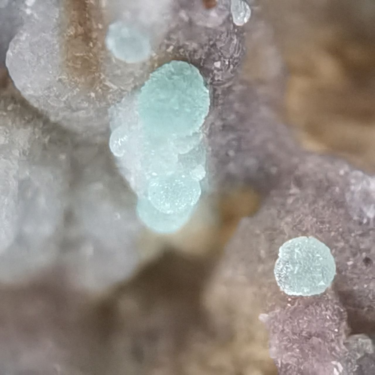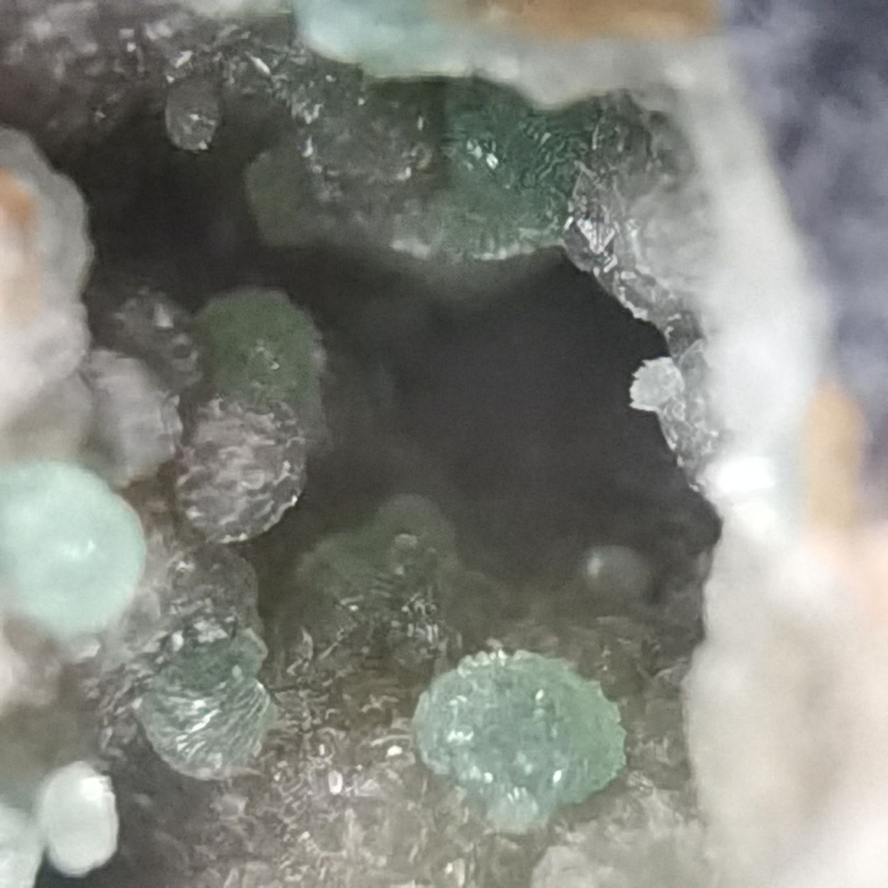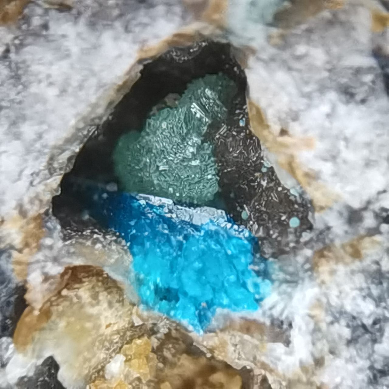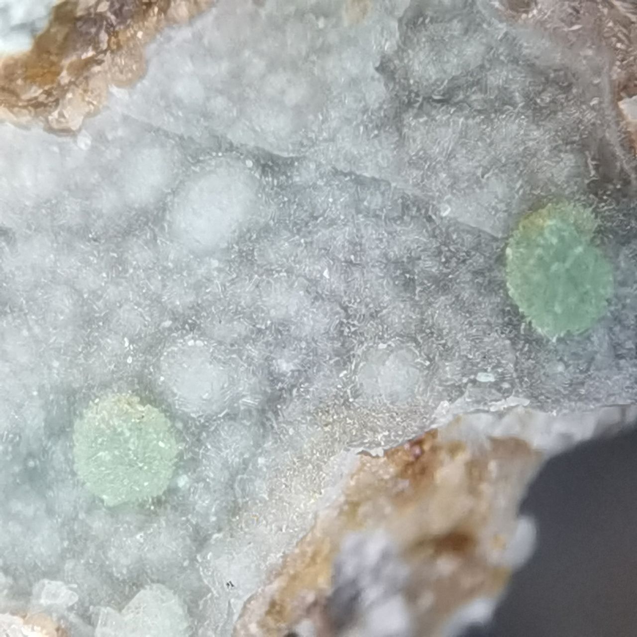 本块标本上的东川石没有经过严格的测试,因此本文就统一用东川石指代一下,其分布在标本上的各处异极矿晶洞里,青绿色/白色的球状集合体和扇形/其他形态的磷锌铜矿形成了非常好的对比。