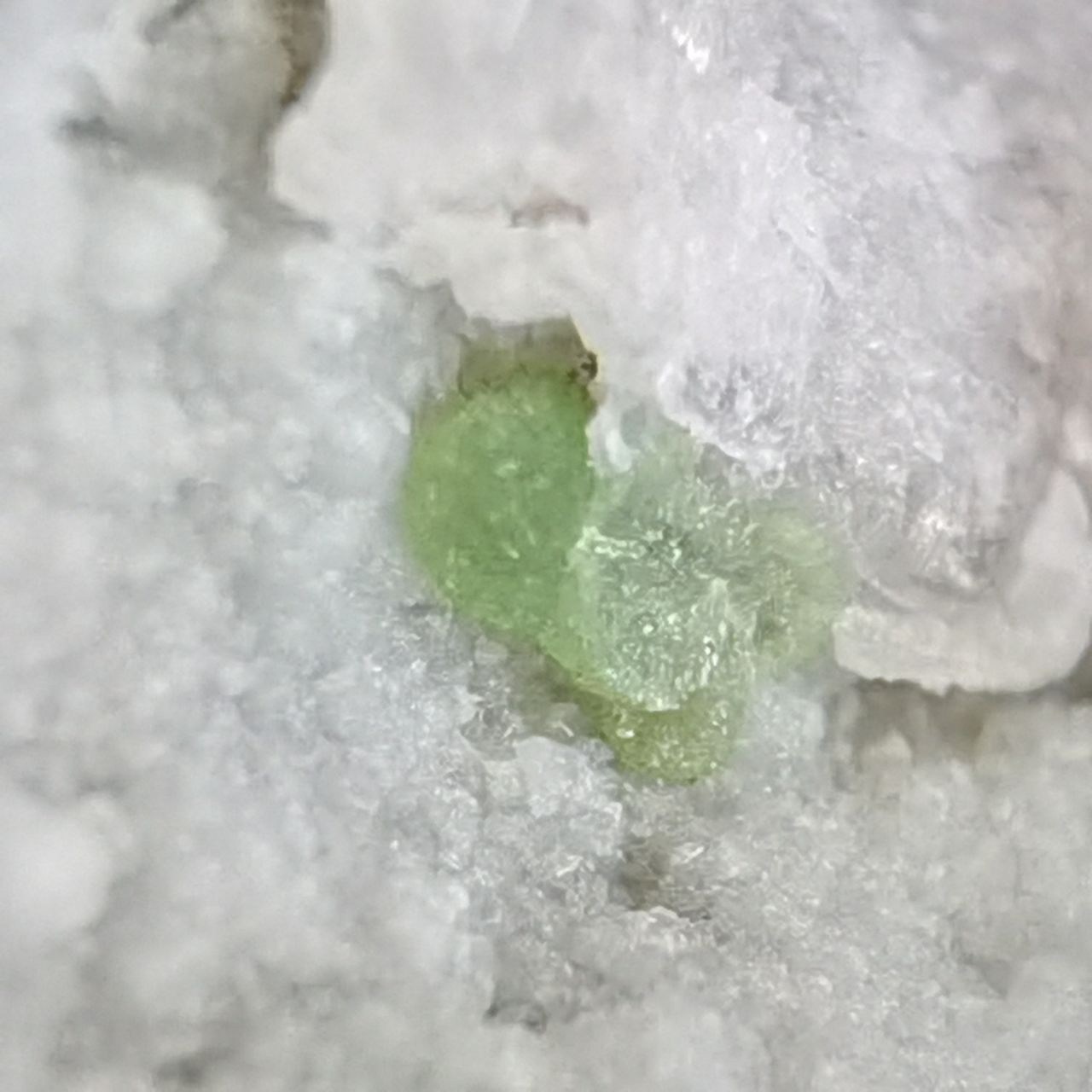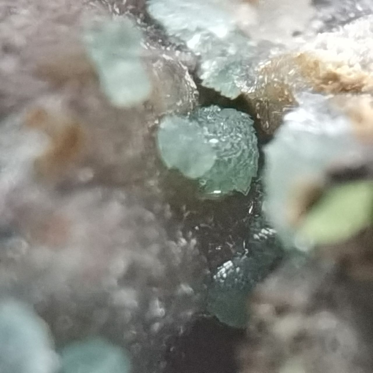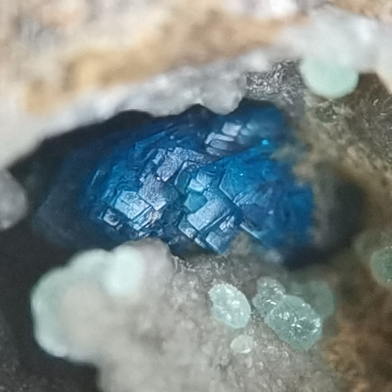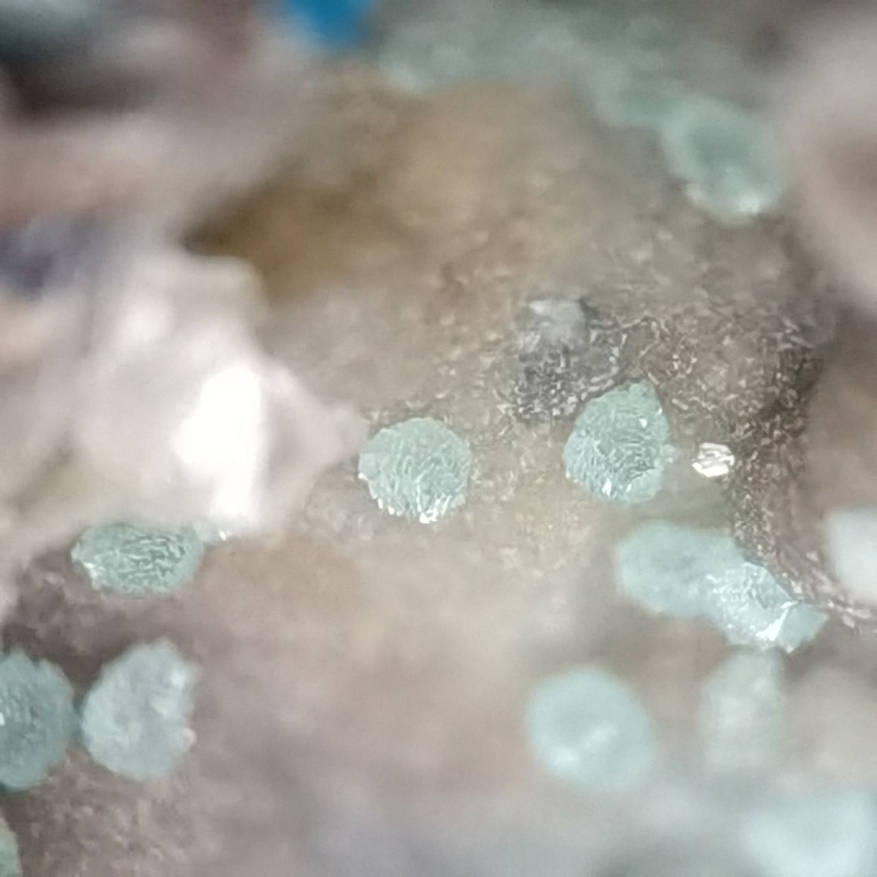 本块标本上的东川石没有经过严格的测试,因此本文就统一用东川石指代一下,其分布在标本上的各处异极矿晶洞里,青绿色/白色的球状集合体和扇形/其他形态的磷锌铜矿形成了非常好的对比。