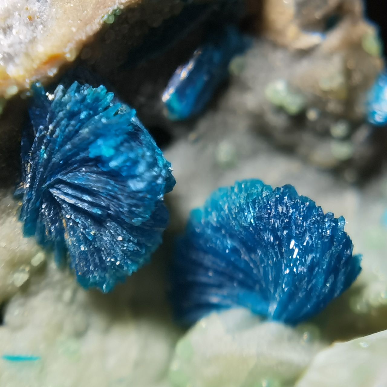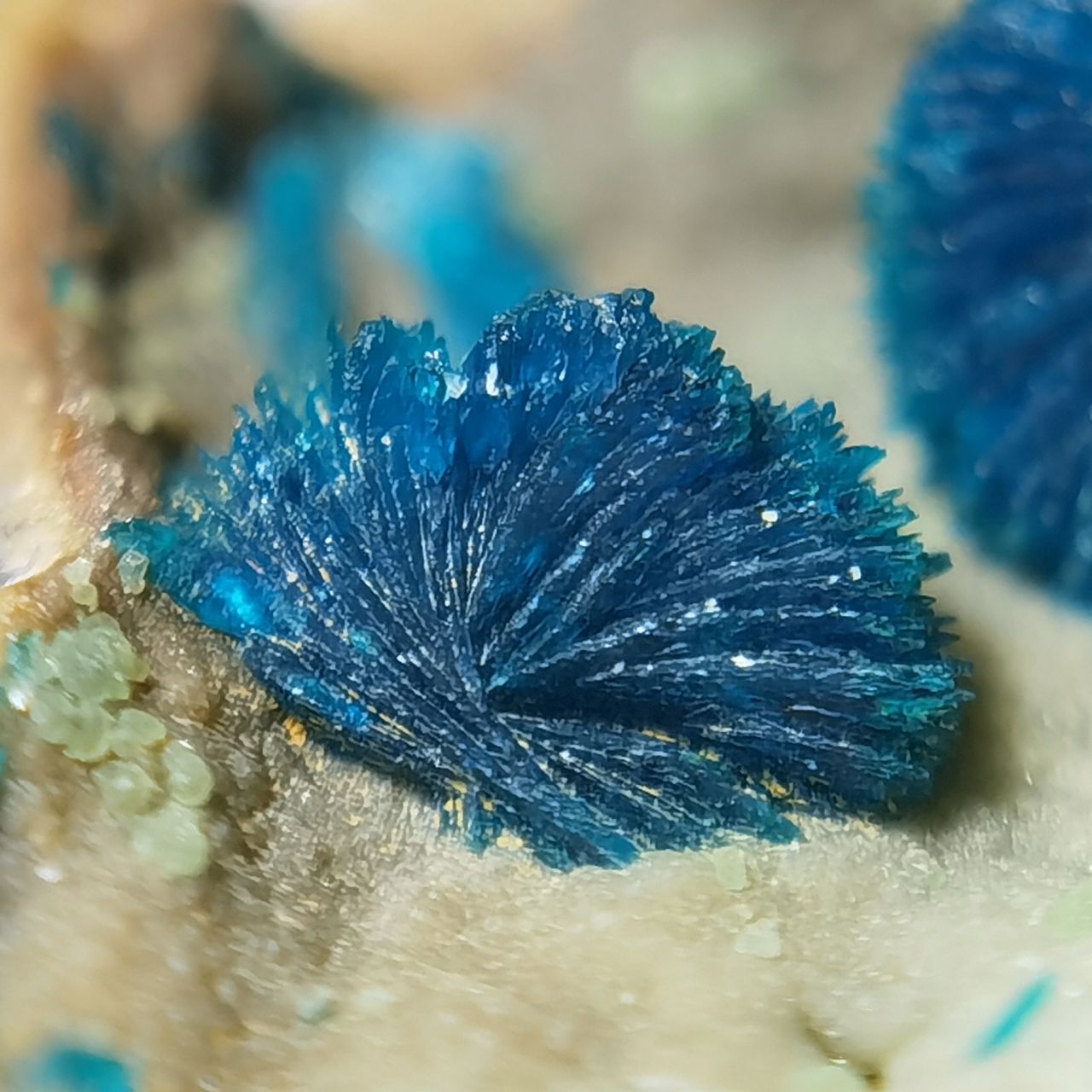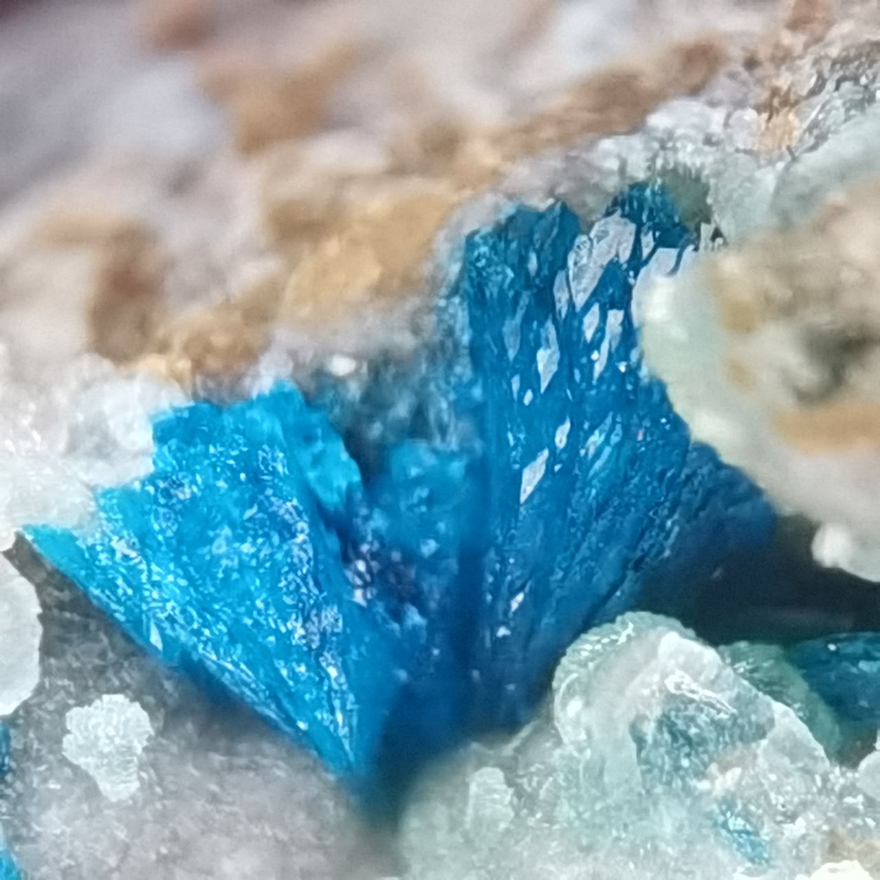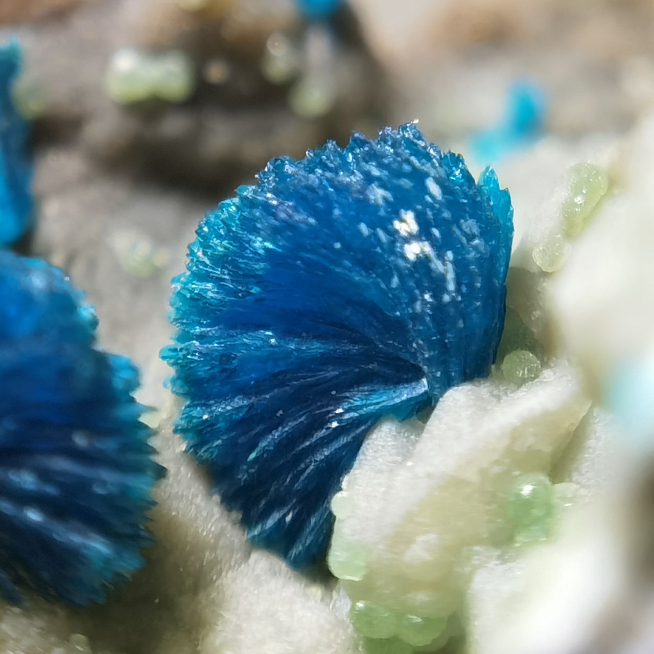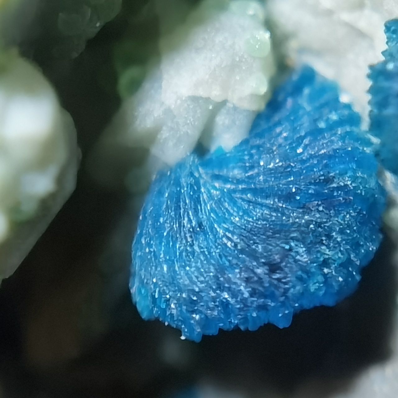 微距下白-蓝-青三色美丽而和谐,扇形磷锌铜矿的结晶质量极高,虽然没有完全长成圆形但下图三已经可以发现花状磷锌铜矿生长时向内部凹陷的特征,大自然的鬼斧神工可见一斑,即使标本没有那么多的东川石单凭借磷锌铜矿展现,也是极为出彩的,今天东川石虽然是主角反而是锦上添花般的存在了。这块标本可以说兼具科普价值和美学价值,也是我以极低价拿下的,非常满意了。