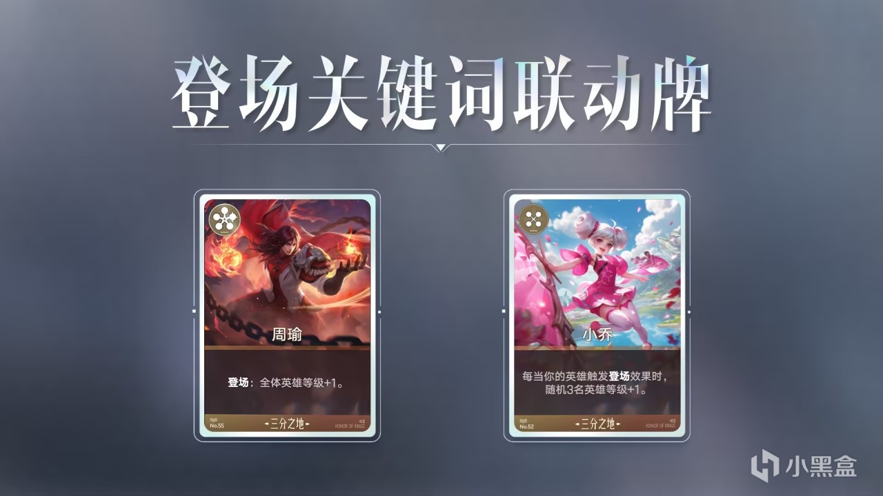一张拥有“登场时,全场英雄等级+1”词条的周瑜,搭配上“场上英雄触发登场词条时,随机3名英雄等级+1”的小乔即可组成小联动 ,这种联动设计让玩家阵容构建从“我该凑哪个羁绊”转变为“这些英雄牌能打出怎样的配合”,玩家更像是在构建一套卡组,考虑英雄牌之间的协同效果,而不是机械的在已有羁绊上进行填充。