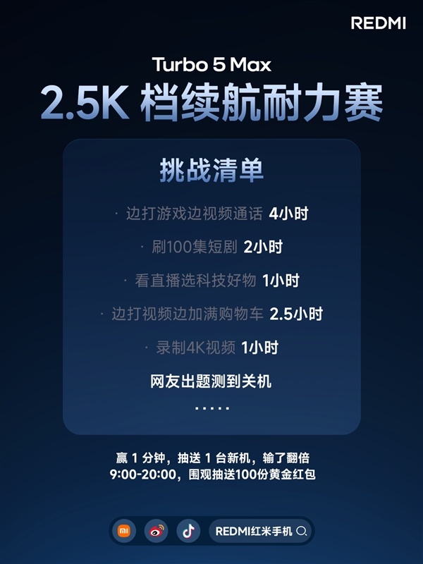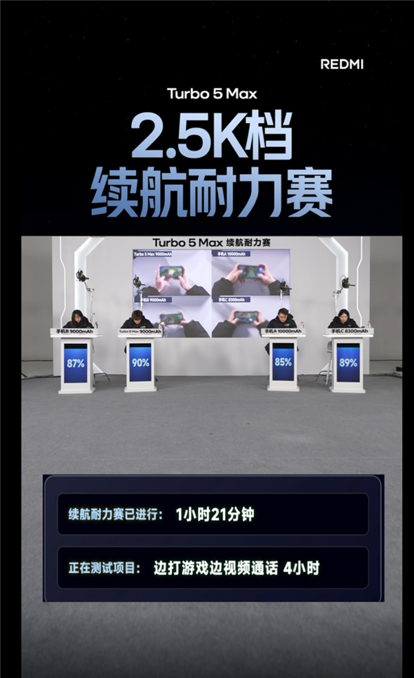 快科技1月20日消息,REDMI宣布,2.5K档续航耐力赛正式开赛,REDMITurbo 5 Max以9000mAh迎战友商10000mAh,实测游戏、视频等重载场景,在相同环境、条件同时开测,不关机不下播。