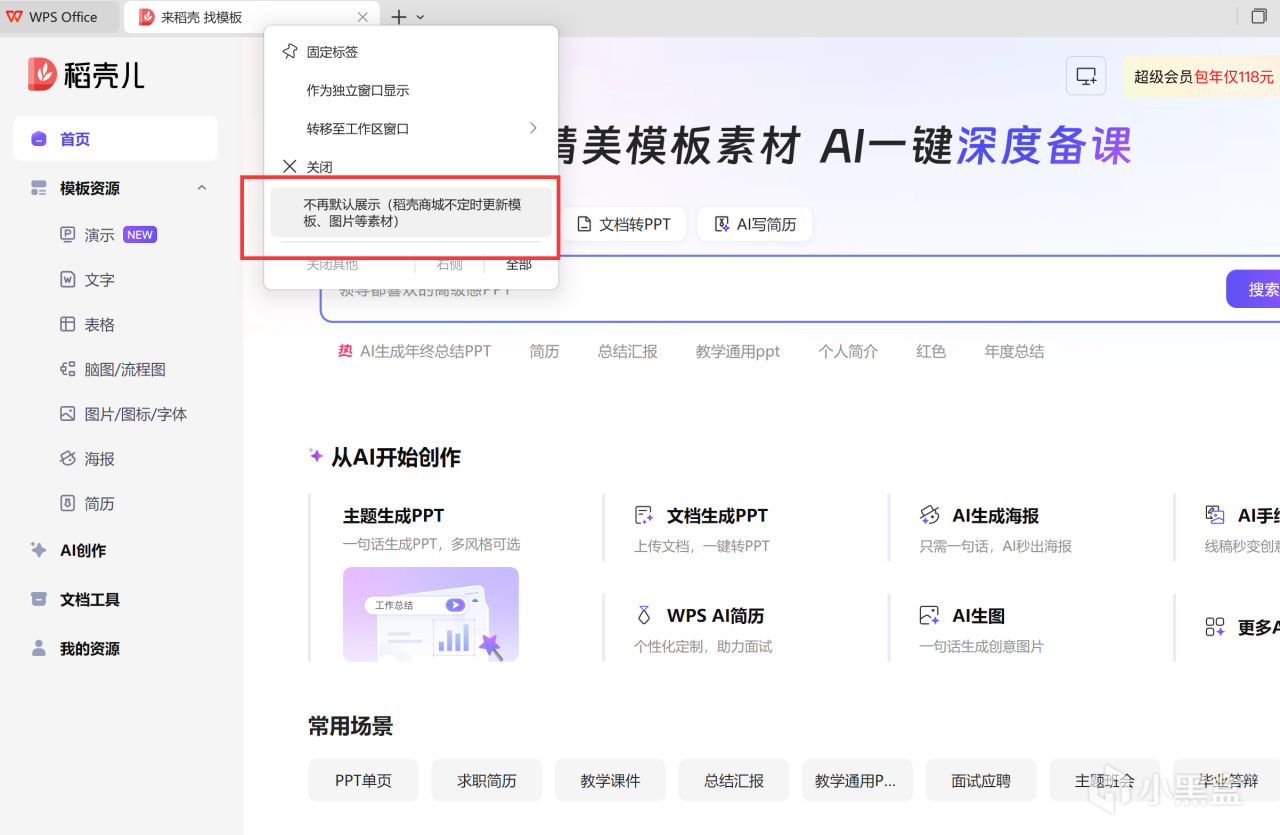 1.去掉每次都会占在开屏首页的稻壳模板:右键,不再默认展示