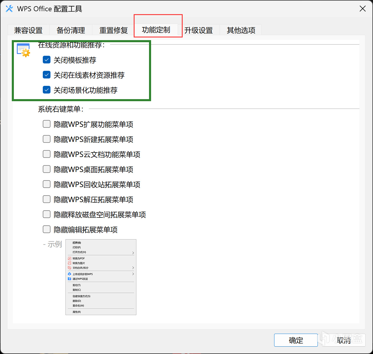 将在线资源和功能推荐中三个选项全部勾选,修改完再打开就不会再占用后台资源了