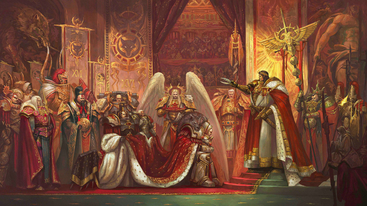 四十千纪之世,人皇之志,赖臣属以续。基里曼[40]为摄政,率师远征,靖平乱局;禁军、星际战士战团拒敌于外,死守疆土;国教以狂热之信仰,凝帝国之心。然人皇状态日衰,黄金王座灵能耗费愈巨,帝国高层有“黑王”之谶[41],谓人皇或为混沌所染,成第五邪神,祸及人类。