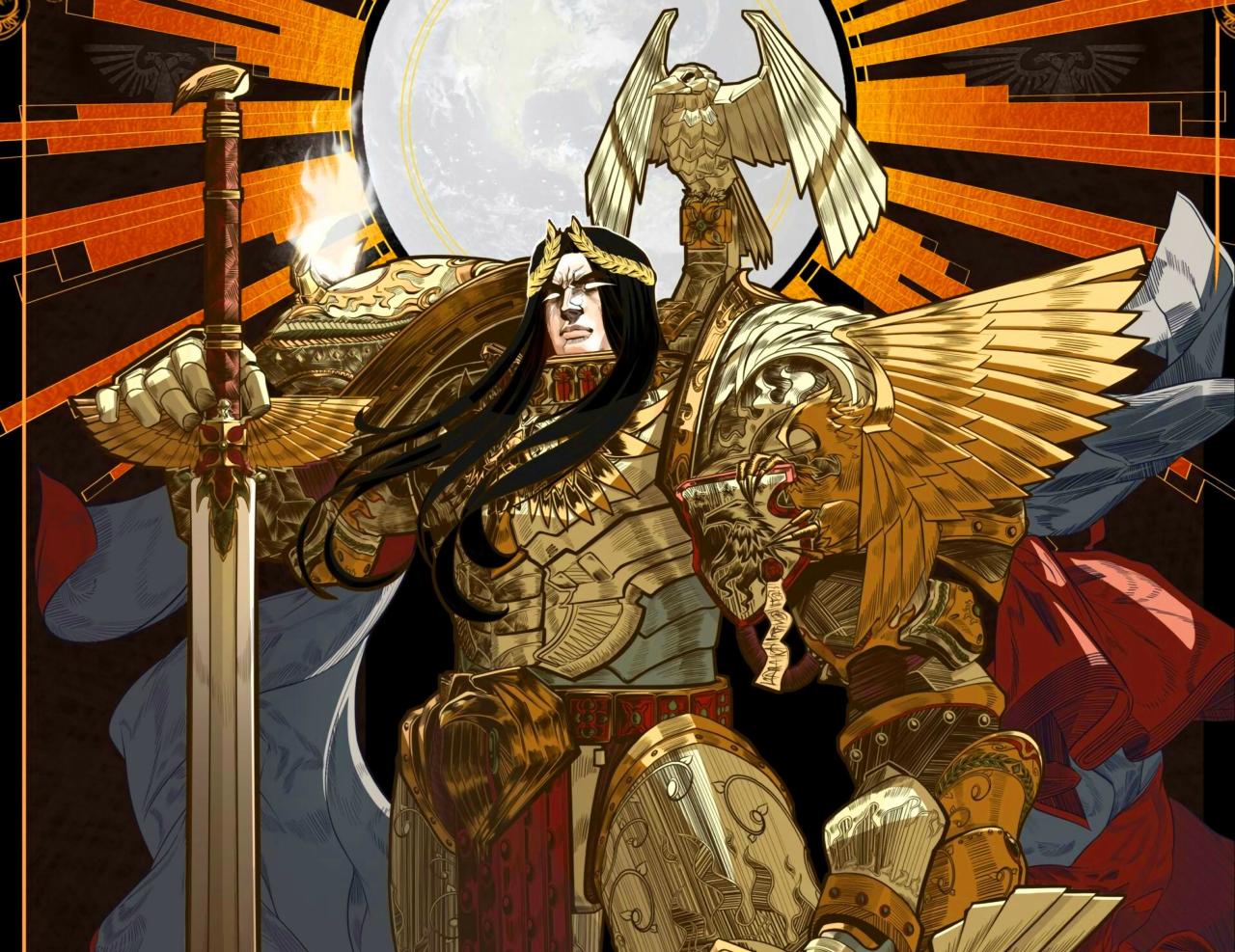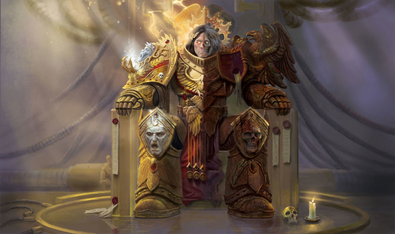 三十千纪[15],人皇显于世间,称“人类之主”,起大远征之师。以基因秘术造星际战士军团,育原体二十,为征伐之锋。其智若神,其力盖世,却坚拒人神之祀[16]。及荷鲁斯乱后,帝国覆亡在即,万民绝望,始奉之为神,狂热之教遂为国教[17],违其本志远矣。