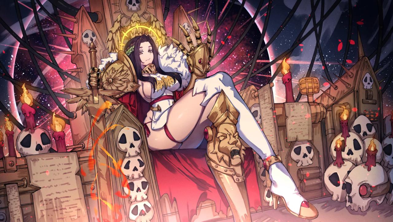 人皇之神性,盖多舛也[36]。彼尝拒为神,濒死后反被尊为至高,国教奉之若天。其灵能与混沌同源,却毕生为人类而战,划清疆界。《终死》[37]之书载,其人借人类众信之力成神,神力出乎物质宇宙,非亚空间之邪能,故为混沌之劲敌,独树一帜。
