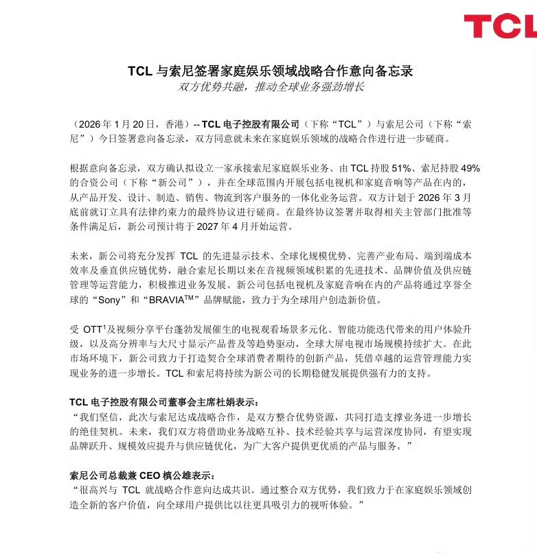 索尼官方还提到,合资公司由TCL持股51%,索尼持股49%,未来将过"Sony"和"BRAVIA"品牌进行推广,打造契合消费者期待的创新产品。