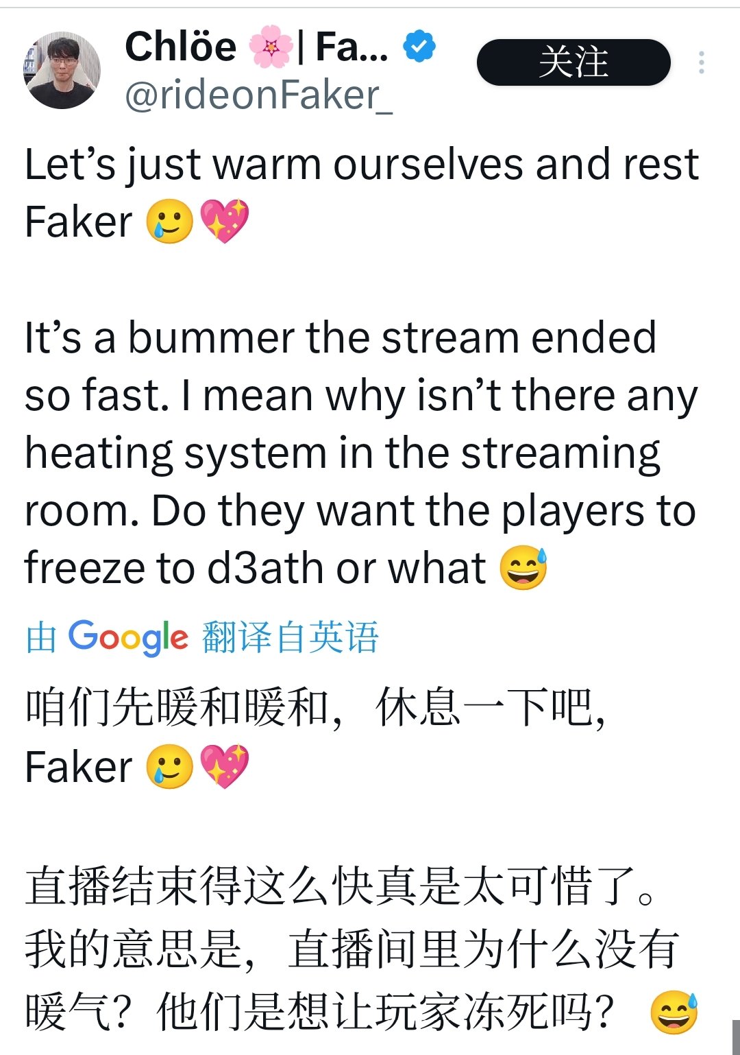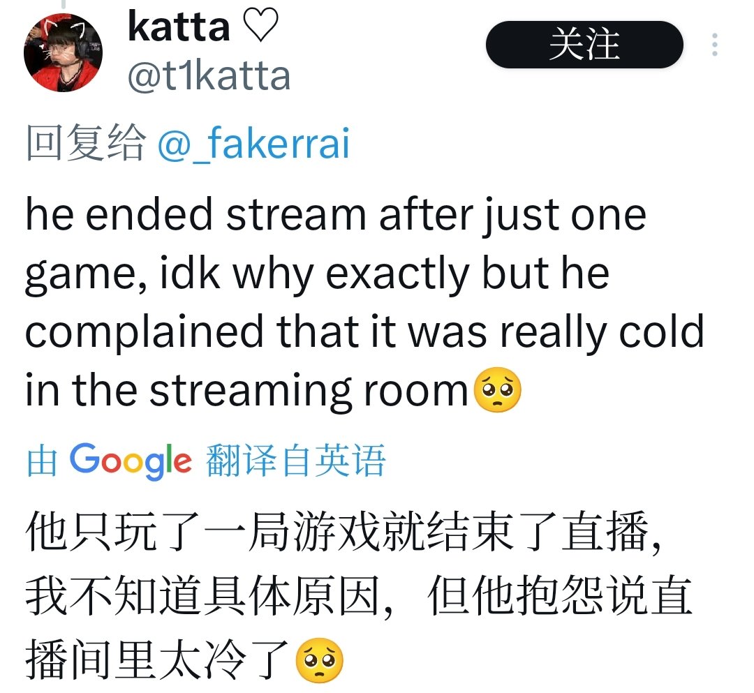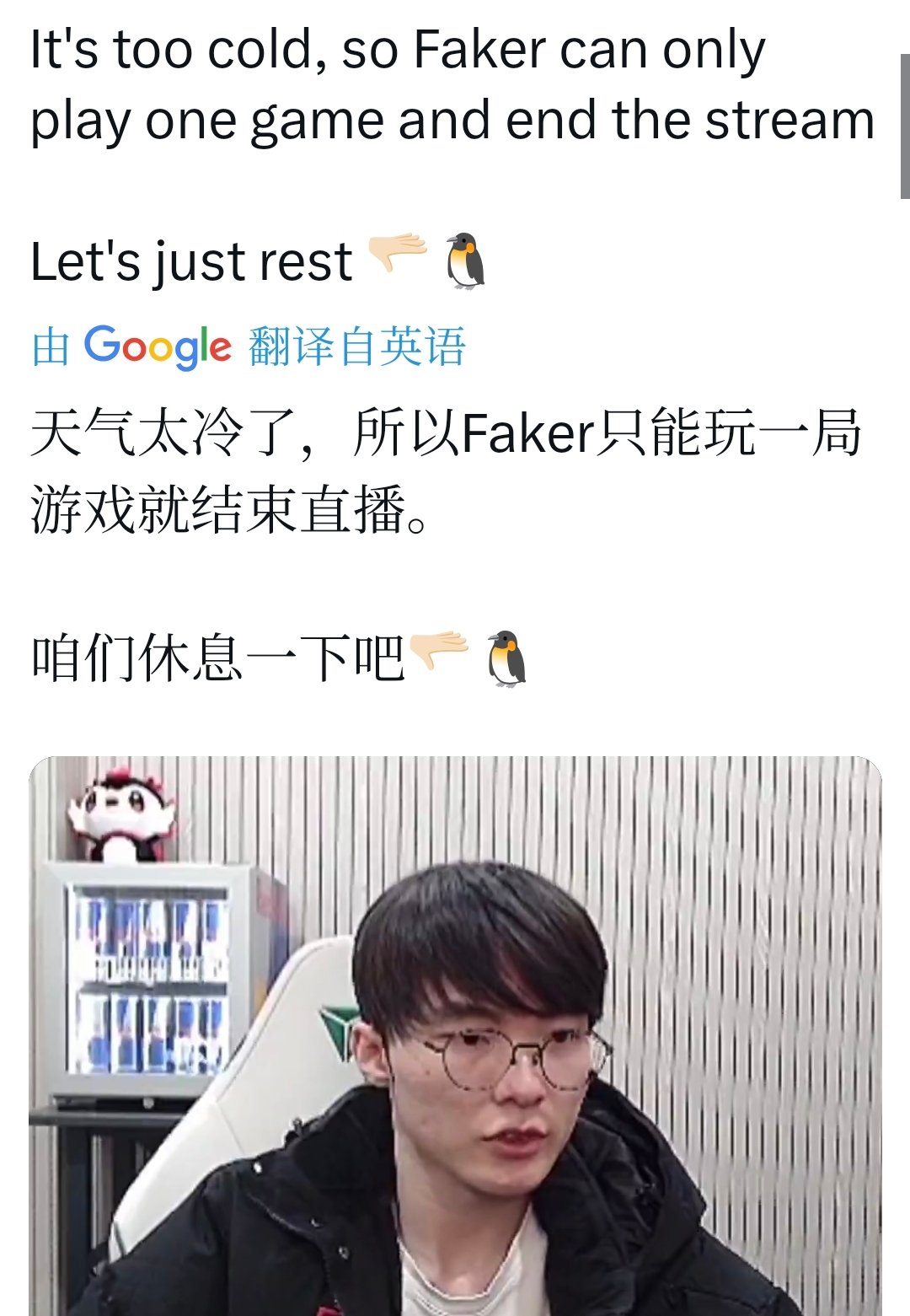 Faker通常在AfreecaTV或SOOP等韩国平台直播,这次也不例外。他刚开始玩游戏时,就多次抱怨“太冷了,暖气坏了吗?”。直播过程中面露难色、揉脚抱怨“脚好冷,脚麻了”,甚至穿上厚羽绒服仍瑟瑟发抖。最终只打了一局,就无奈中断:“今天就这样吧,太冷了。” 粉丝剪辑的视频显示,他全程裹紧衣服,表情从专注转为无奈,整个直播仅持续不到30分钟。