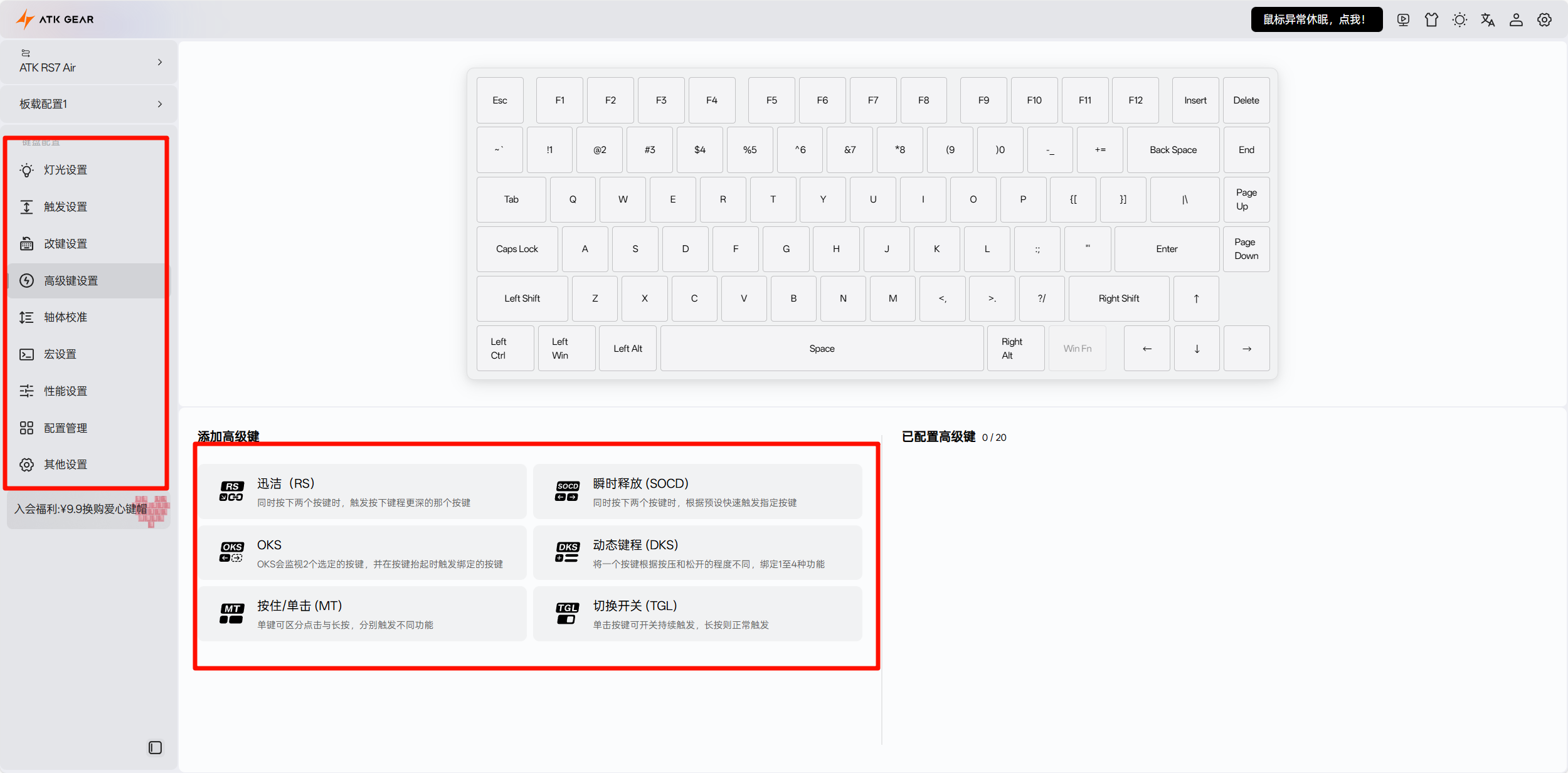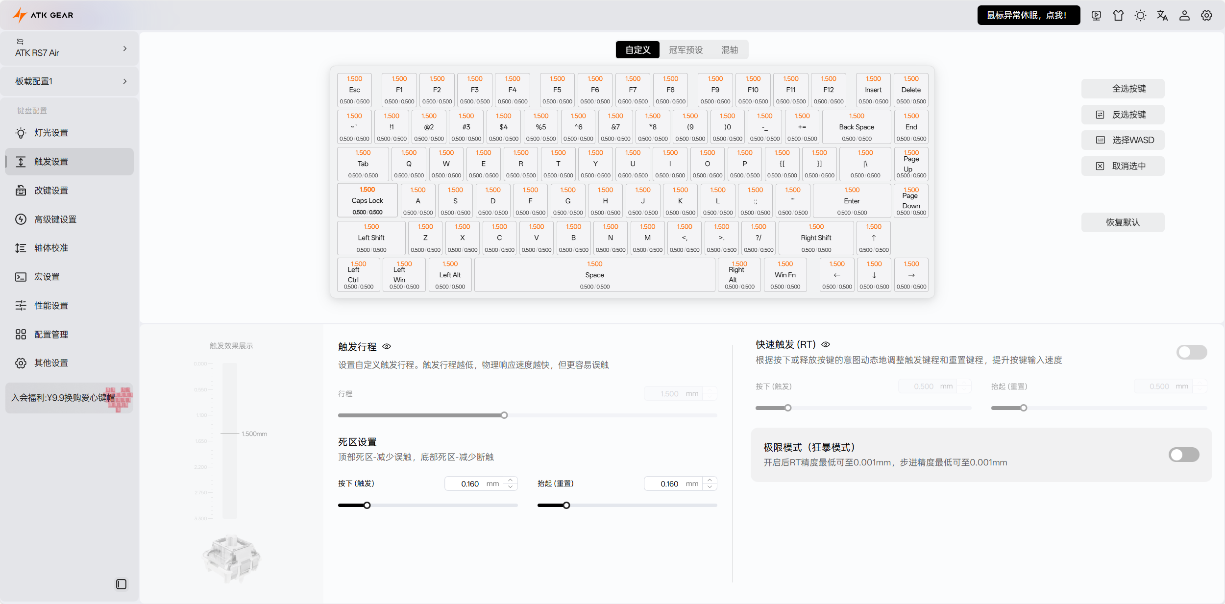 ATK的双端驱动做的确实好,自诩行业领先是一点问题都没,不管是UI设计还是功能页面布局都让人非常舒服,除了常规功能,还支持磁轴特有的RT、 SOCD、DKS、MT、TGL高级键,最重要的驱动里还给到了职业选手的RT参数预设,可以直接一键体验职业选手键盘设置,当下独一档的设置。