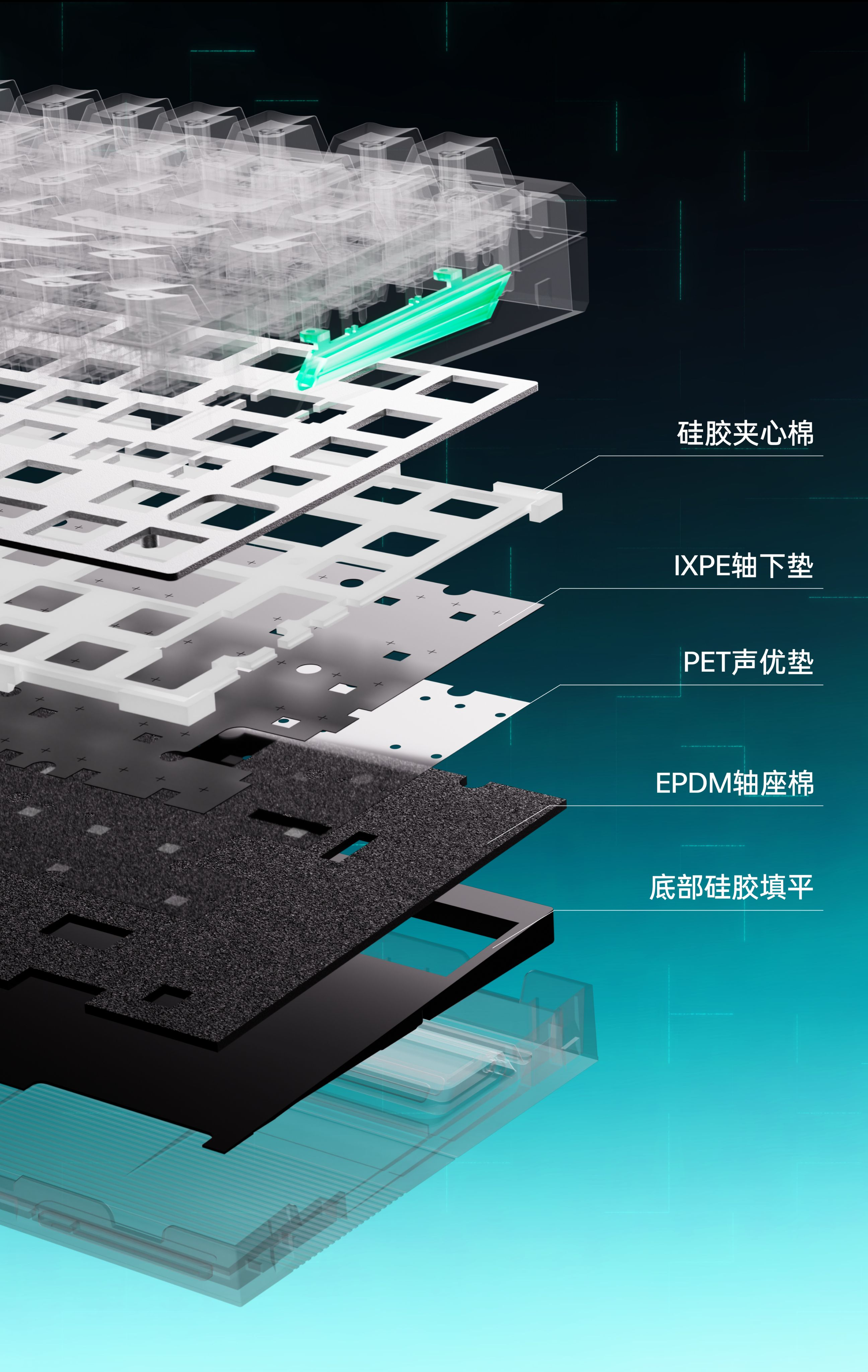 RS7 Air的结构是硬Gasket结构,区别于常规Gasket结构的软弹,有铝合金定位板的缘故带来的触底手感很扎实。消音包给到了5层,硅胶夹心棉、IXPE轴下垫、PET声优垫、EPDM 轴座棉以及底部硅胶。