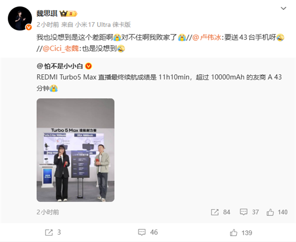 由于最初预估不足,直播间仅准备了20台新机,为兑现承诺,魏思琪随即发布微博补充抽奖,送出剩余23台新机。